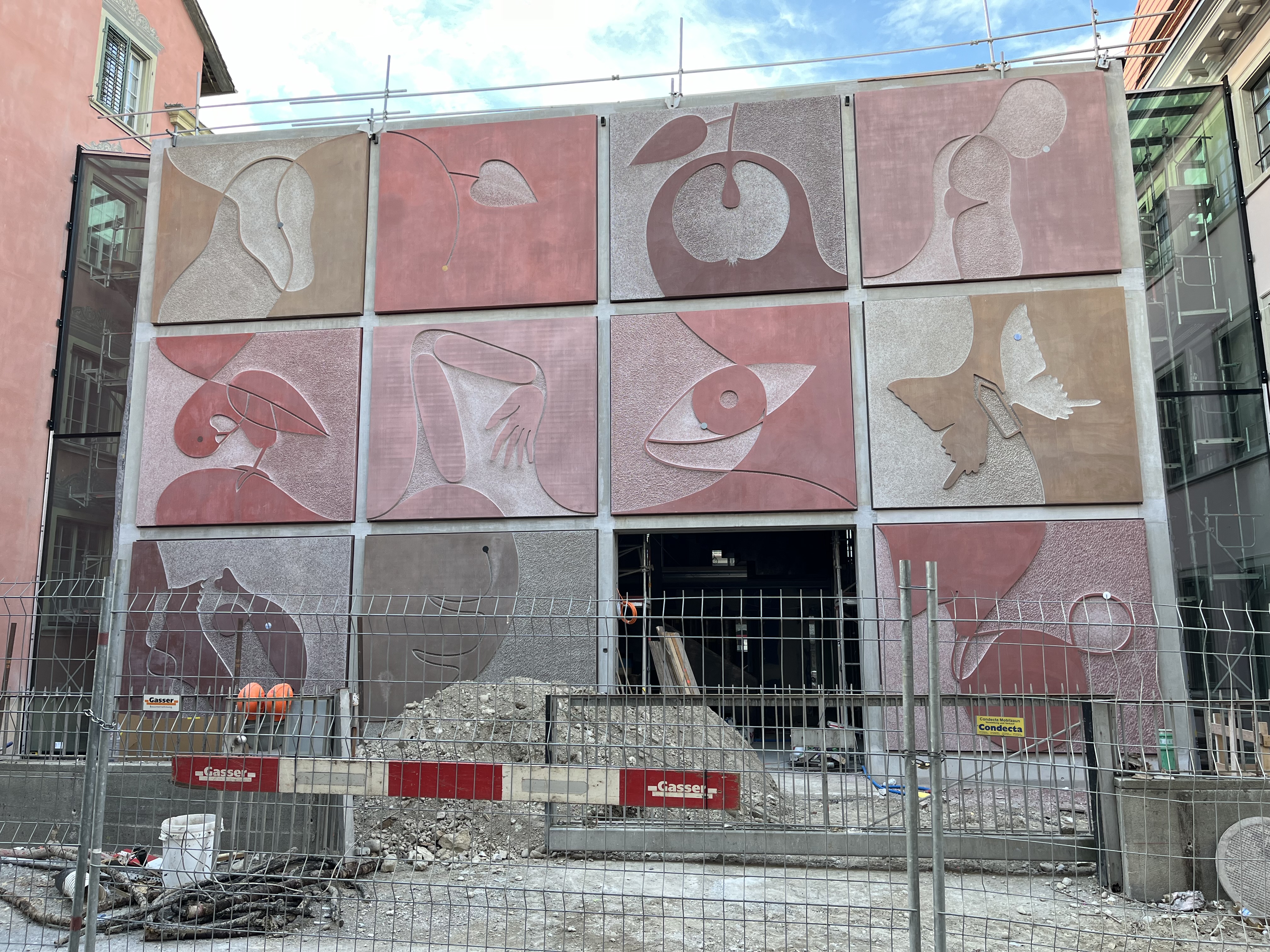 Spaziert man in diesen Tagen der Stadthausgasse entlang, wird das Auge von zwei Objekten mächtig angezogen. Zum einen ist da das Mansardendach auf dem Hause Eckstein, das sich, überaus markant, nicht nur von hier aus in die Netzhaut brennt; daneben fällt der Blick auf die Fassade des entstehenden Stadthauses. Auf elf quadratischen Platten hat der Künstler Yves Netzhammer verschiedene Sujets in den Beton meisseln lassen. Einige davon erlauben auch eiligen Passanten eine Interpretation, erscheinen als Fuss, Hand oder Auge; andere verlangen, abstrakt gehalten, für eine erste Deutung eine Pause uns etwas mehr Fantasie.