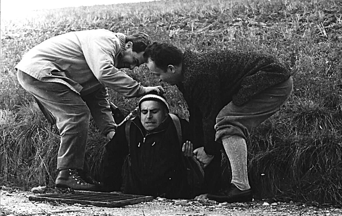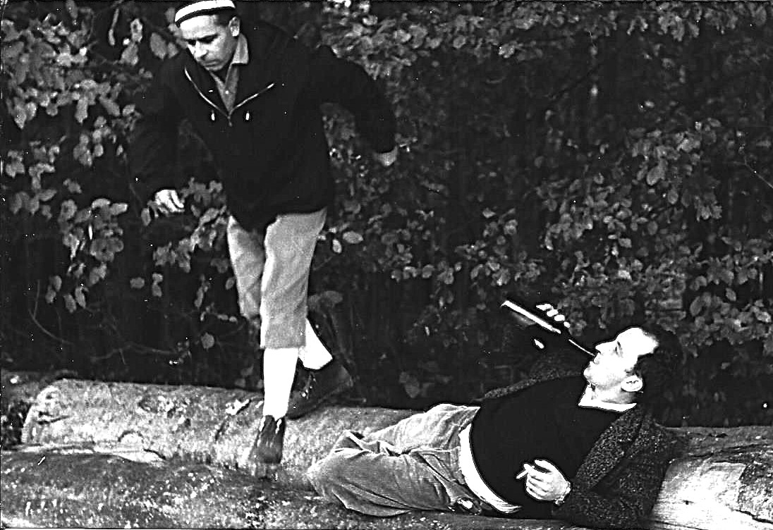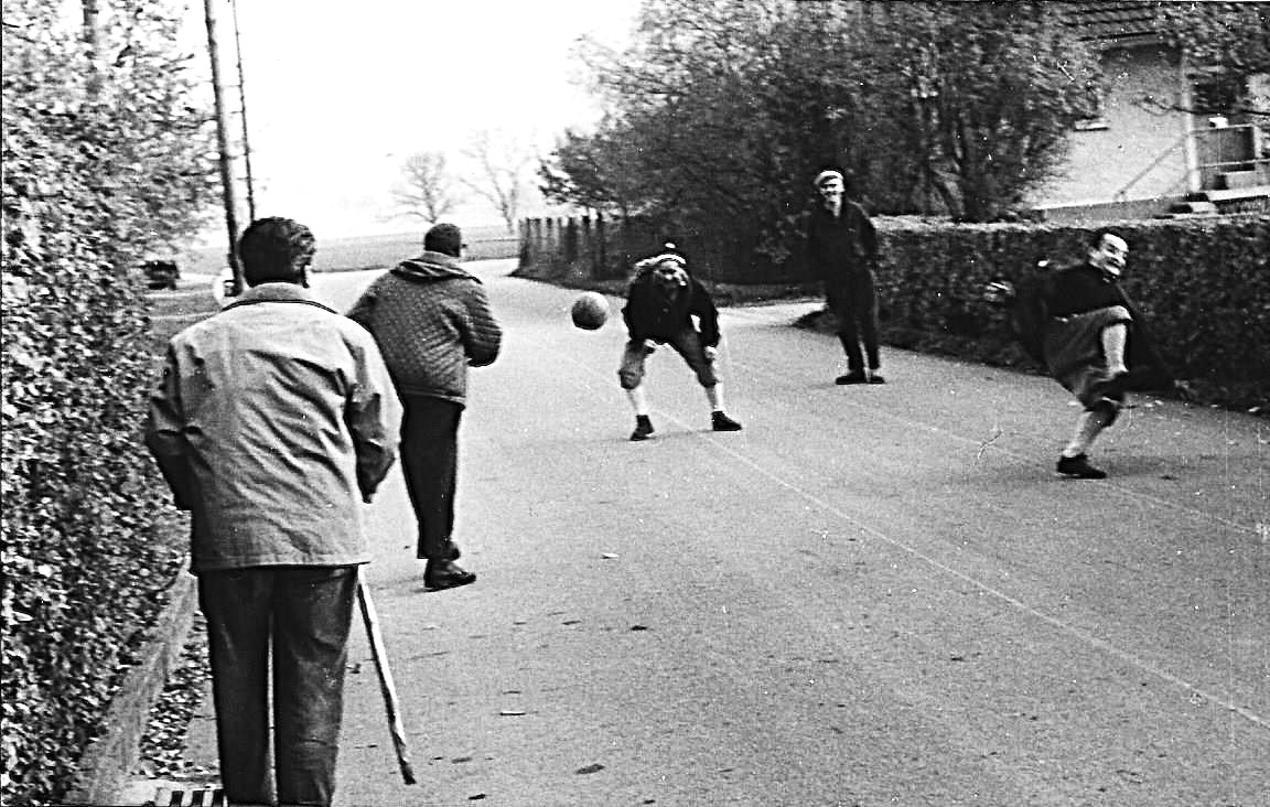 Nun aber geht's los mit einer originellen Fotoserie, die vermutlich aus den späteren 50er-Jahren stammt. Sie zeigt Erwin, meinen Vater (mit schwarz/weisser Mütze) im Kreise von vier Freunden - vielleicht Kameraden aus der Zeit des Aktivdienstes, möglicherweise alles Bergsteigerkollegen, denn mein Vater war ein begeisterter Alpinist.