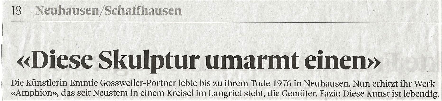 Die Werke von Emmie Gossweiler-Portner waren angesehen und wurden prominent ausgestellt. Der Architekt Walter M. Förderer (1928-2006) lernte und arbeitete bei ihr. "Ihren Einfluss kann man sogar hier und da an seinen Arbeiten ablesen", so Rawyler. Im Vorfeld der Positionierung der Skulptur im Auge des Langrietkreisels wurde all dies jedoch nicht kommuniziert. Mäni Frei: "Irgendeines Tages steht das Teil dort. Ich denke: Was ist jetzt das wieder? Einfach typisch Neuhausen. Es fehlt am Konzept. Ich finde das Objekt nicht schön."