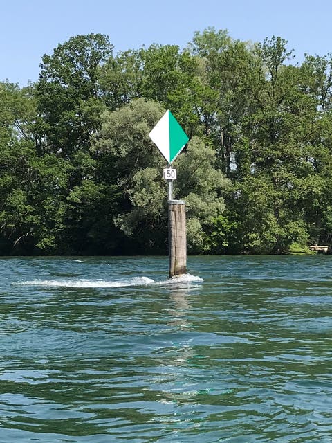 Die Wiffen konnten wir gefahrlos umfahren. Sie sind eigentlich schon von Weitem hörbar, bzw. das Wasser, das um sie herumrauscht. Aber nach einer Biegung, so etwa auf der Höhe des Schupfens, kam uns plötzlich ein Kursschiff entgegen. Vermutlich wurde es anderntags für eine Charterfahrt ab Stein am Rhein oder Kreuzlingen benötigt, denn es war zwar hell erleuchtet, aber ohne Passagiere. Und wieder war meine Batterielampe eine enorme Hilfe, mit der ich die Schiffscrew auf unsere Anwesenheit aufmerksam machen konnte. Wir hatten ja kaum eine Ahnung, wo wir uns befanden. Dümpelten wir noch irgendwo im Flachwasser herum oder blockierten wir womöglich die Fahrrinne für die Kursschiffe?