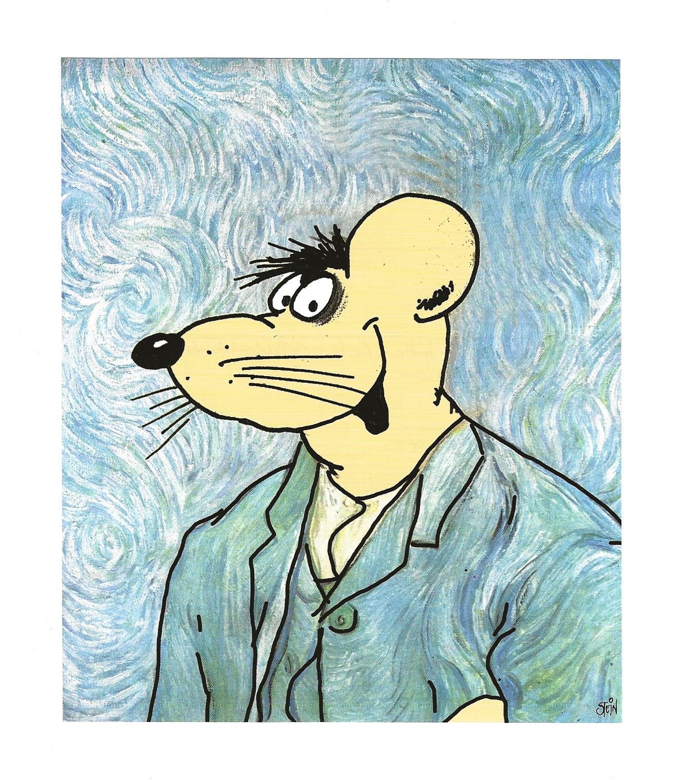 Original: Vincent van Gogh, Selbstbildnis - barhaupt, mit geöffnetem Rock vor wirbelförmigem Hintergrund. Hier in einer sehr freien "Bearbeitung" von Uli Stein, deutscher Cartoonist und Fotograf. (* 26.12.1946 in Hannover, † 29.08.2020 in der Wedemark [bei Hannover])