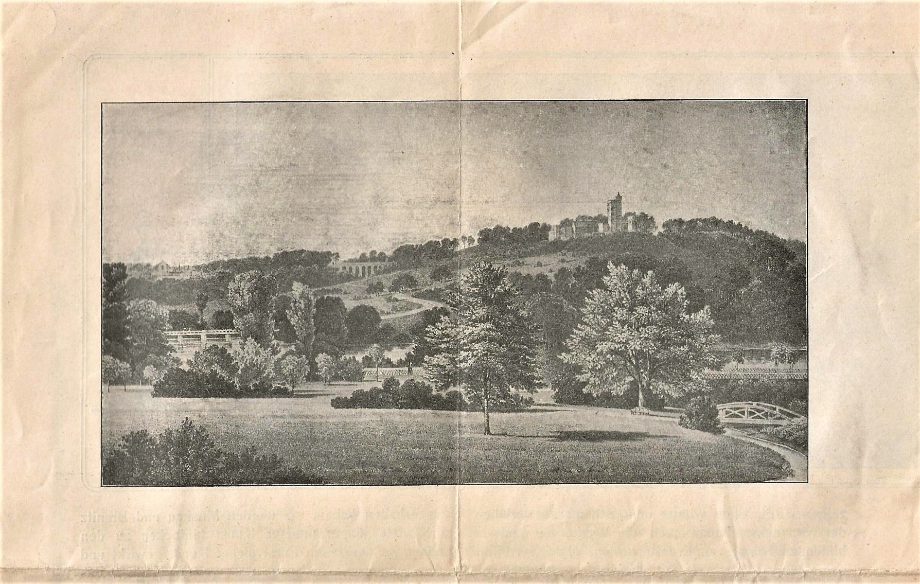 Oben: Auszug aus dem Prospekt mit lithographischer Darstellung eines Parks.