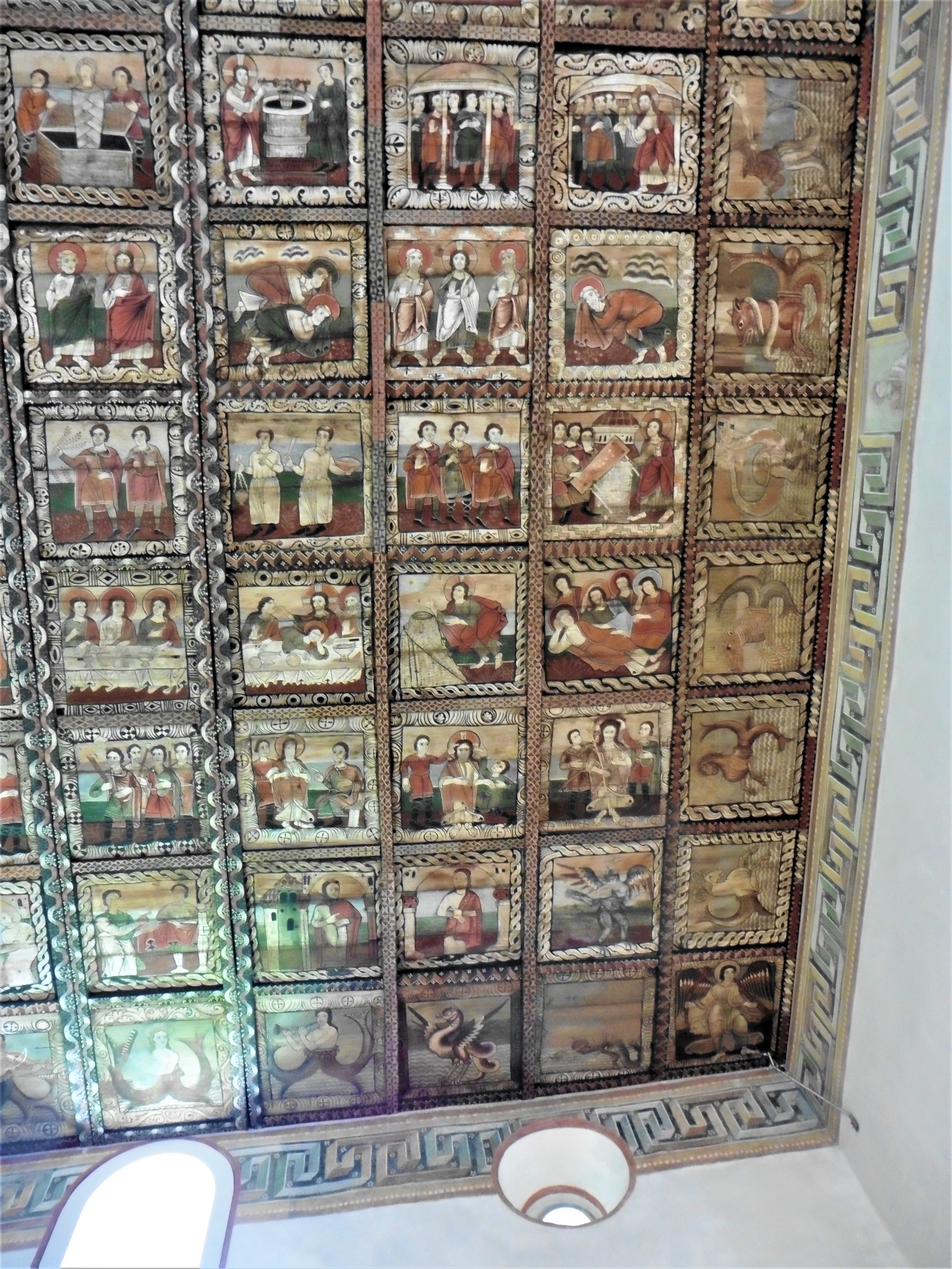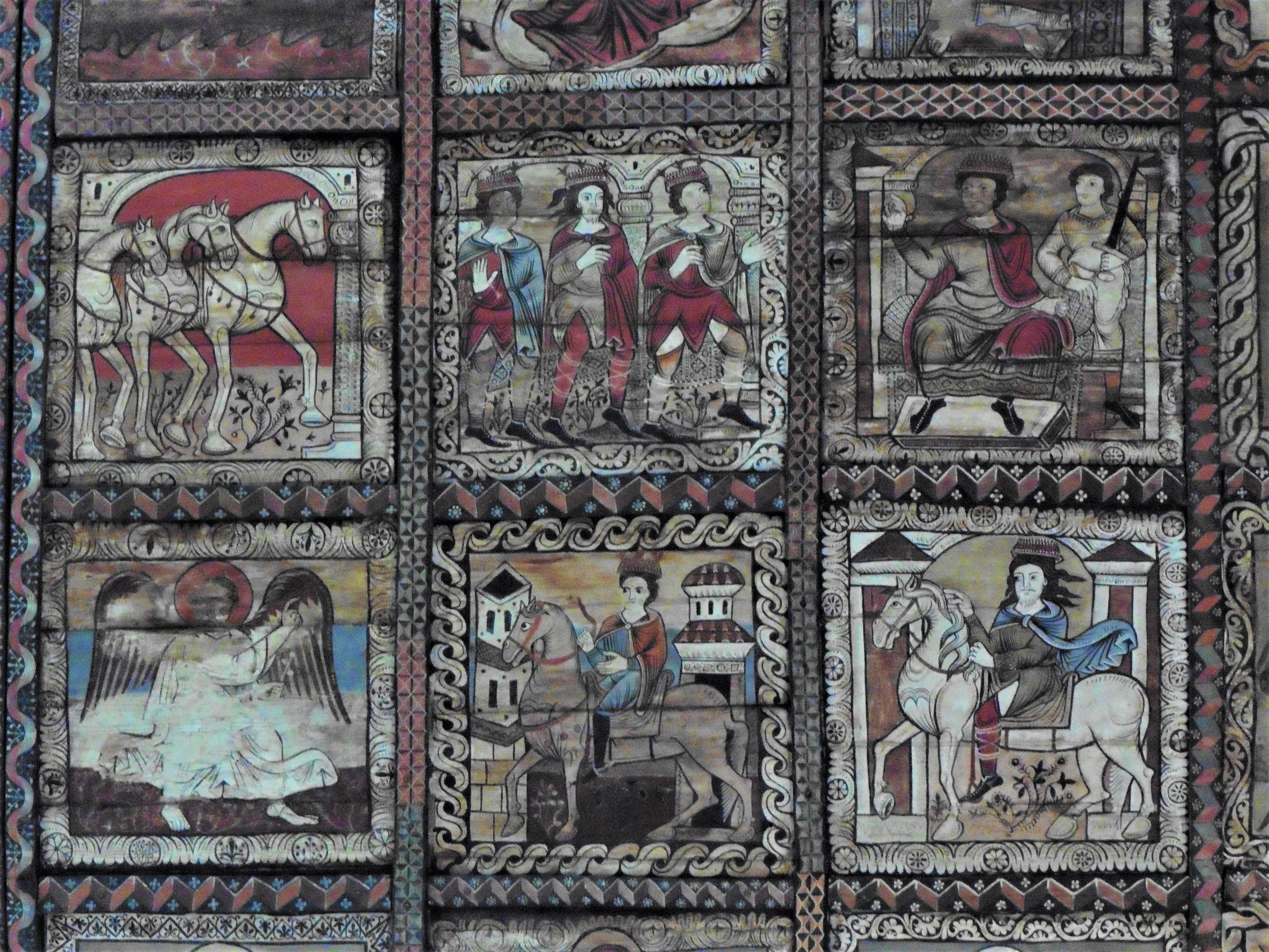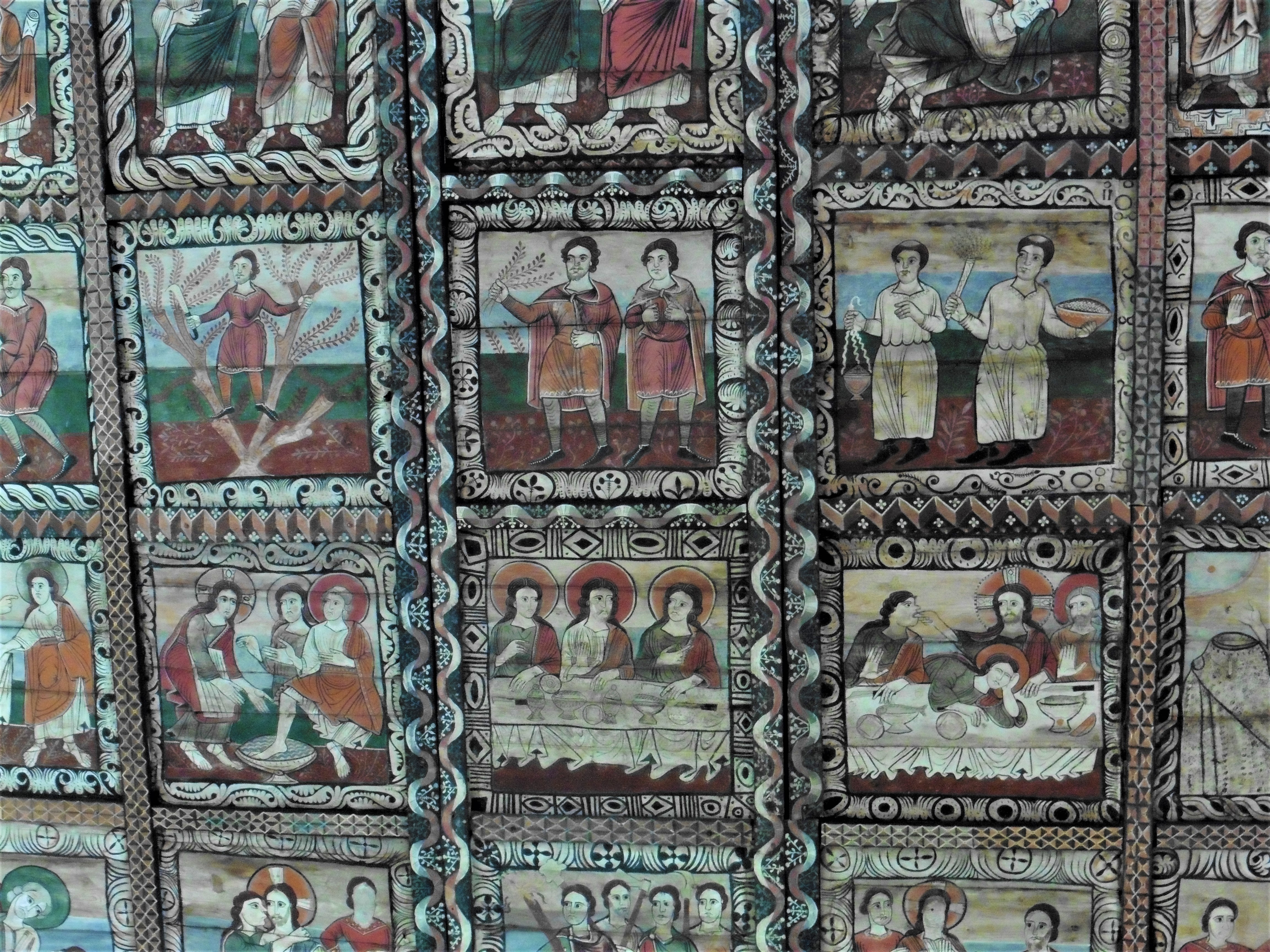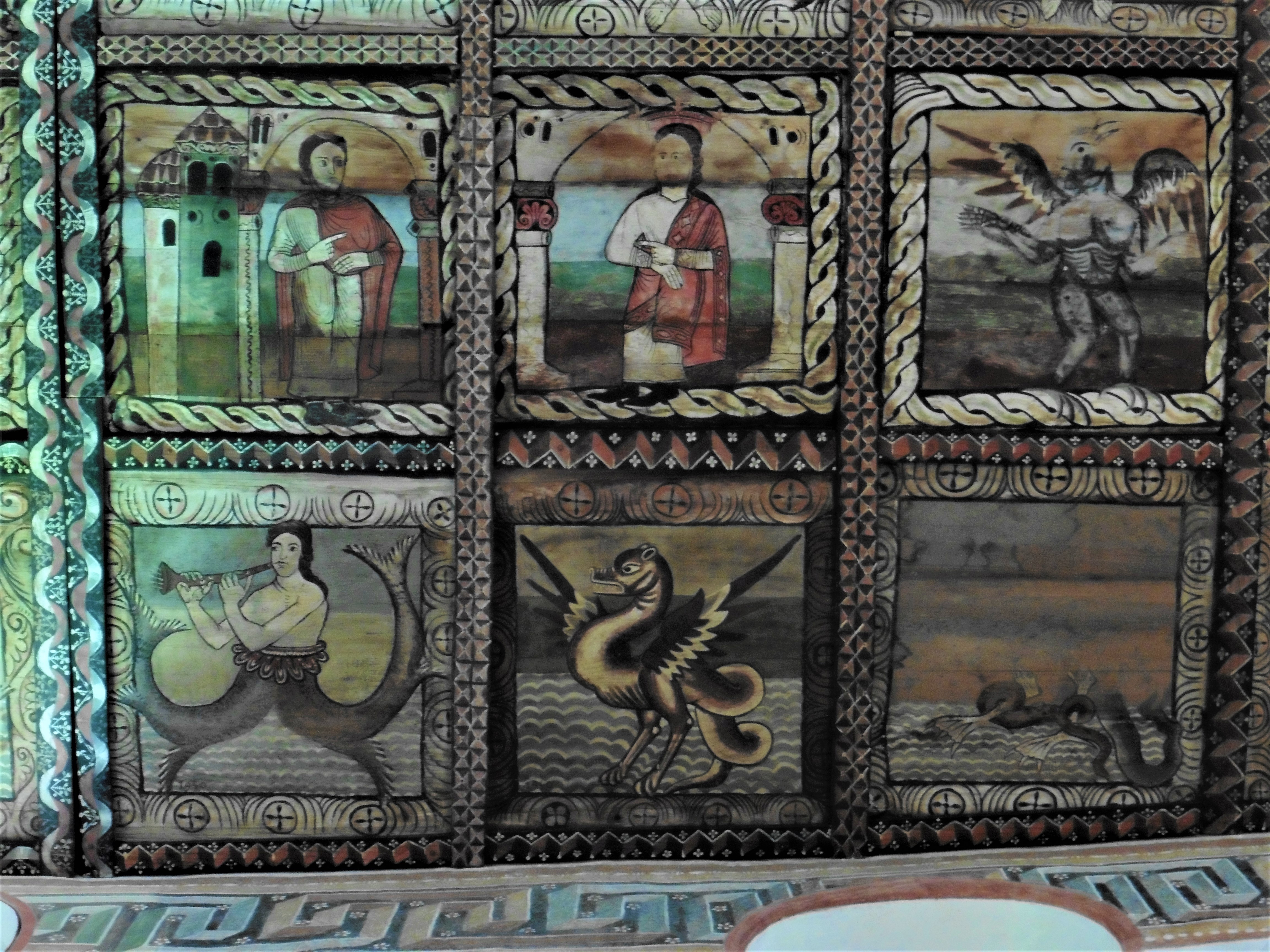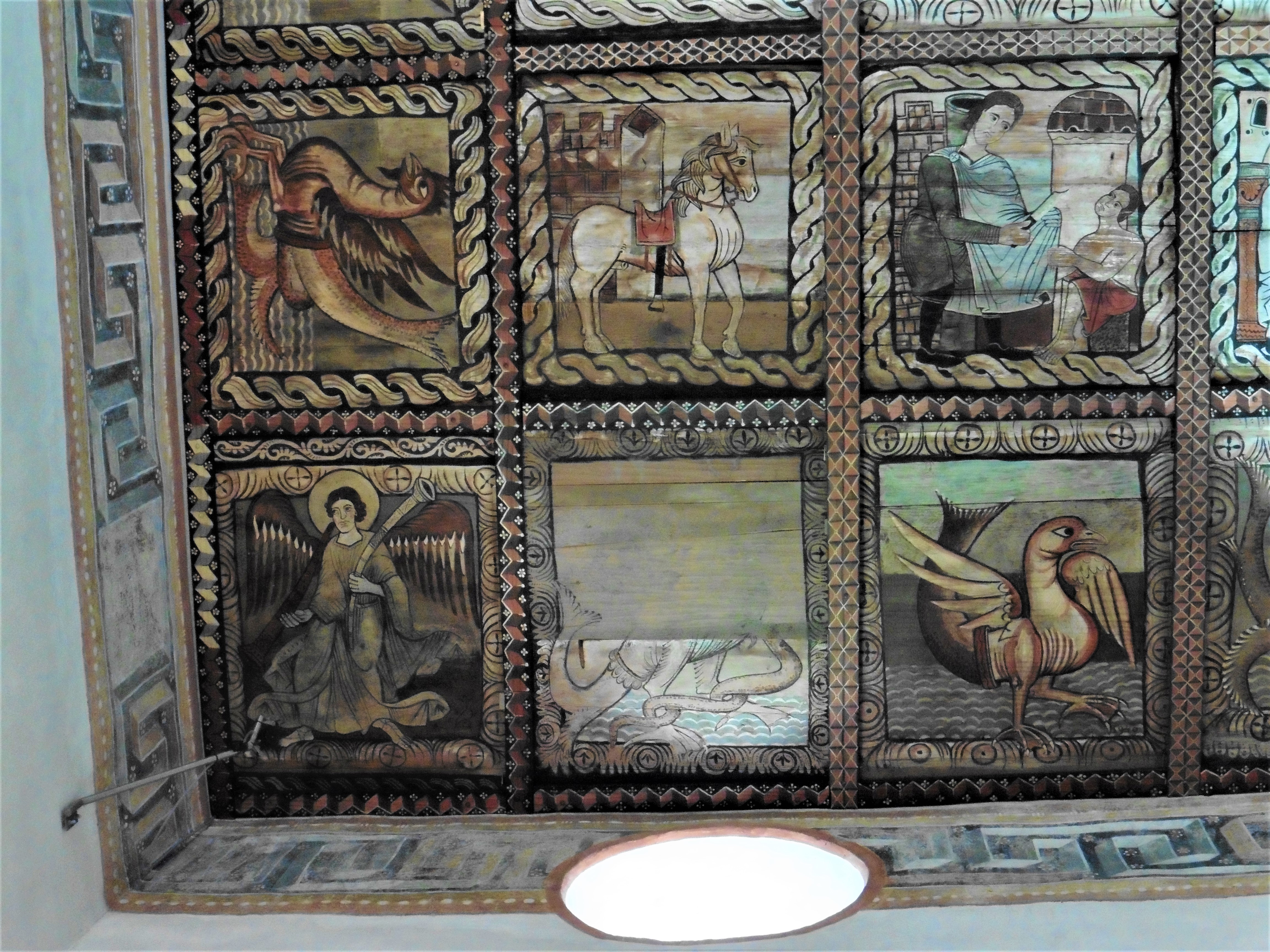 Die Bilderdecke ist nach einer mittelalterlichen Vorstellung der Erde gegliedert. Die Randfelder zeigen Meer (erkennbar an den wellenförmigen Einfassungen), das von Fabelwesen bevölkert wird. In den Ecken stehen Engelsfiguren, die die vier Winde darstellen. In den Binnenfeldern, auf dem Land sozusagen, wird das Leben Jesu bis zur Dornenkrönung erzählt. Ergänzt werden die Darstellungen um sieben Tafeln zur Legende des Kirchenpatrons.
