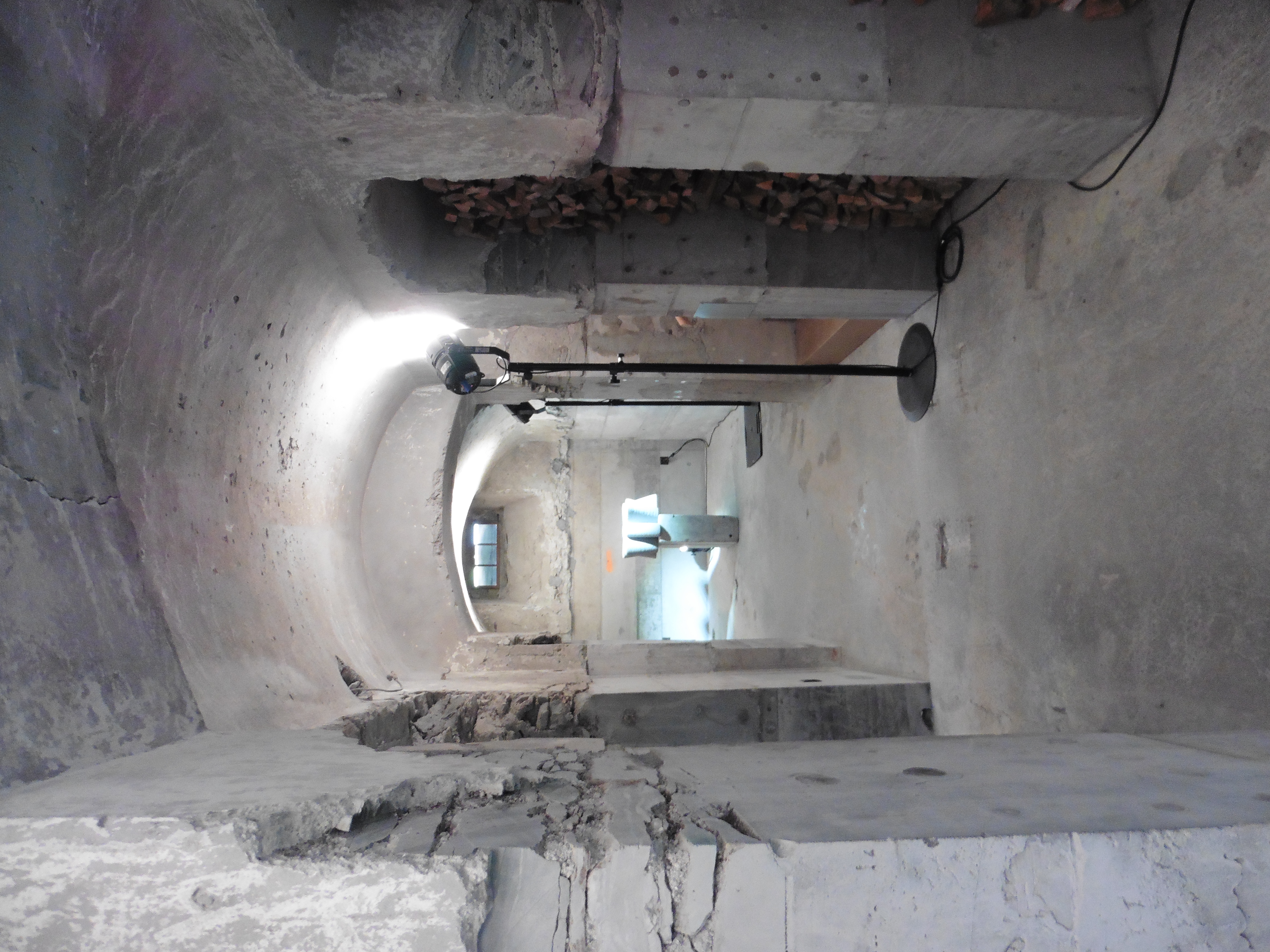 Ein Blick in das Kellergeschoss. In der Nische befindet sich ein Brennholzvorrat. Das Kellergewölbe ruht auf dem vor der Verschiebung neu erstellten Betonfundament. Die sauberen Trennlinien sind deutlich auszumachen. Im Hintergrund "moderne Kunst" aus dem 3-D-Drucker.