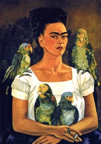 Als Künstlerin bearbeitete Frida Kahlo in ihren Bilder ihr Leiden - insbesondere die chronische Krankheit -, aber auch ihre Eheprobleme. Ihr Gesamtwerk umfasst 143 Gemälde, davon sind 55 Selbstbildnisse. Nach unzäligen Operationen an Wirbeln und der Amputation ihres rechten Unterschenkels, blieb von Fridas Lebensfreude in ihrer Kunst kaum etwas übrig. Frida wirkt in all ihren Bildern ernst, wobei die Ernsthaftigkeit aber meistens von hellen Farben kontrastiert wird. Ihre zusammengewachsenen Augenbrauen werden in ihren Selbstporträts zu ihrem "Markenzeichen". Oft werden sie von ihr viel stärker hervorgehoben, als sie in Wirklichkeit waren. Oft weisen kleine Symbole in ihren Bildern auf seelische und körperliche Wunden hin. Fridas Werke zeigen surrealistische Einflüsse, doch sie selbst lehnte diese Zuschreibung ab. "Man sagt über mich, ich male surrealistische Bilder. Doch das ist nicht wahr. Ich male nur meine eigene, kranke Realität!"
