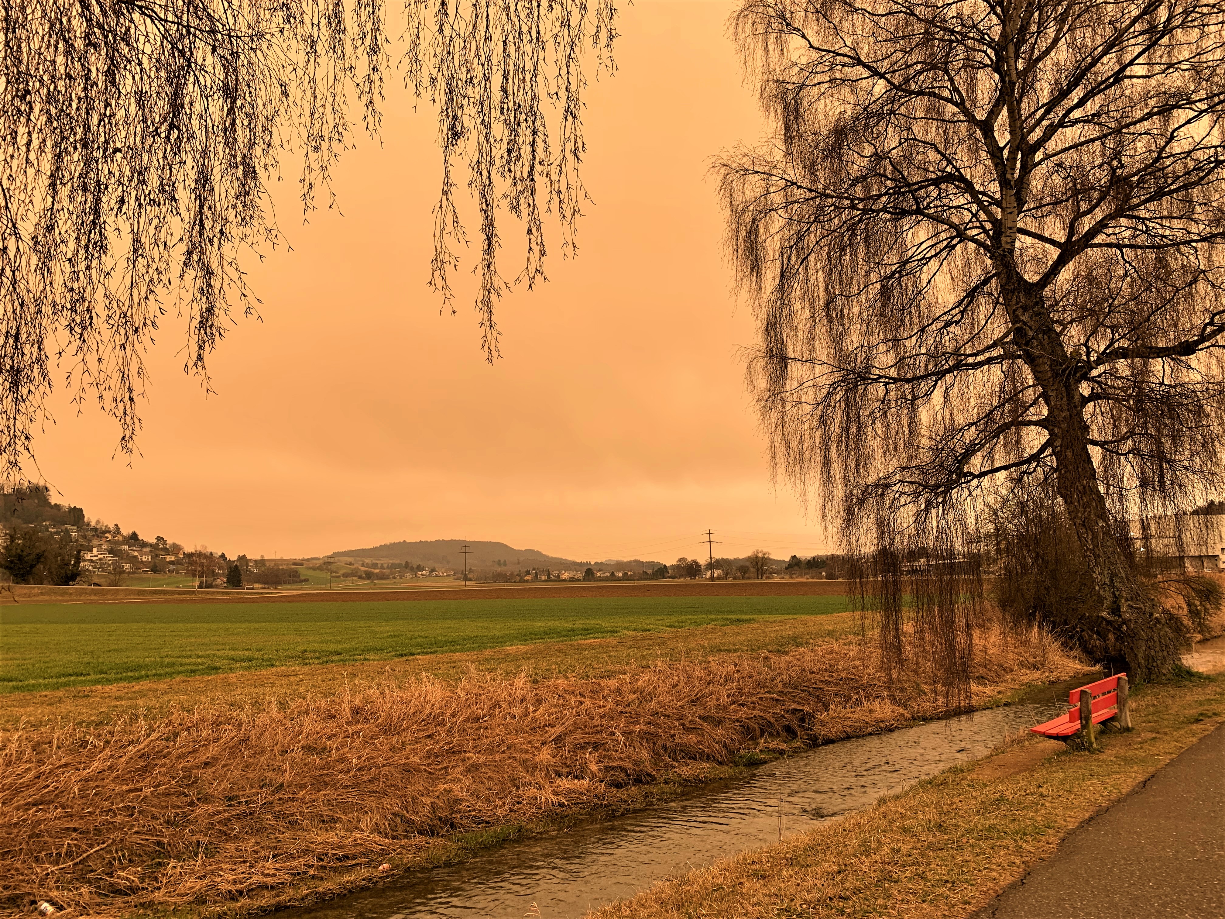 Abenddämmerung im Spätherbst? Keinesfalls. Es ist nachmittags um halb vier und eigentlich sollte eine vorfrühlingshaft warme Sonne an einem knutschblauen Himmel strahlen. Stattdessen frischte der Wind auf und laue Böen liessen feinen Staub aus der Sahara herabschweben. Das Farbenspiel erreichte am frühen Nachmittag seine intensivste Phase. Für ein paar wenige Stunden tauchte der Wüstensand den Himmel wie auch die gesamte Umgebung in ein zauberhaftes, beinahe mystisches, orange- bis ocker-farben getöntes Licht.
