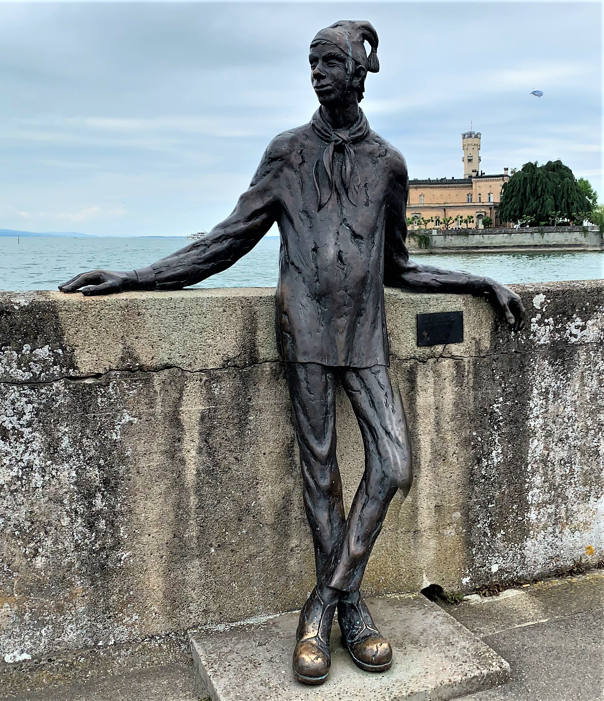 Seit seiner Renovierung und Wiedereröffnung im März 1997 prägt das historische Kavalierhaus mehr denn je das Ortsbild Langenargens. Das Haus ist inzwischen zu einem kulturellen Zentrum geworden - es hat im Erdgeschoss ein Café und im 1. Stock eine Atelierwohnung, die jährlich an Kunststipendiaten vergeben wird. Darüber beherbergt das Kavalierhaus zudem noch einen Saal, in dem kulturelle und private Veranstaltungen stattfinden. Vor dem Gebäude lädt seit dem Jahr 2000 ein junger "Kavalier" zum Verweilen ein. Innerhalb eines Augenblicks hat die Künstlerin Esther Seidel ihre Skulptur genannt, die in farbig patinierter Bronze auf einem Steinsockel geschaffen wurde. Die Idee für das Kunstwerk entwickelte sich durch den Wunsch von Esther Seidel, die Menschen durch den Blick des jungen Mannes, der auf sie gerichtet ist, in das Wesen der Skulptur mit einzubeziehen. Nicht monumental, also unerreichbar, möchte die Skulptur sein, sondern durch die Treppen, die der Betrachter hinaufsteigen kann, animiert sie die Spazierenden, sich nach oben zu begeben, um den eigenen Blickwinkel zu verändern. N.B.: die Laterne, die der junge Mann in der rechten Hand trägt, gehört eigentlich nicht zur Skulptur. Irgendein "Nachtbube" hat ihr das Accessoir in die (leicht geöffnete) Hand gegeben. Ich finde, dass das Kunstwerk dadurch auf originelle Art nur bereichert wird.