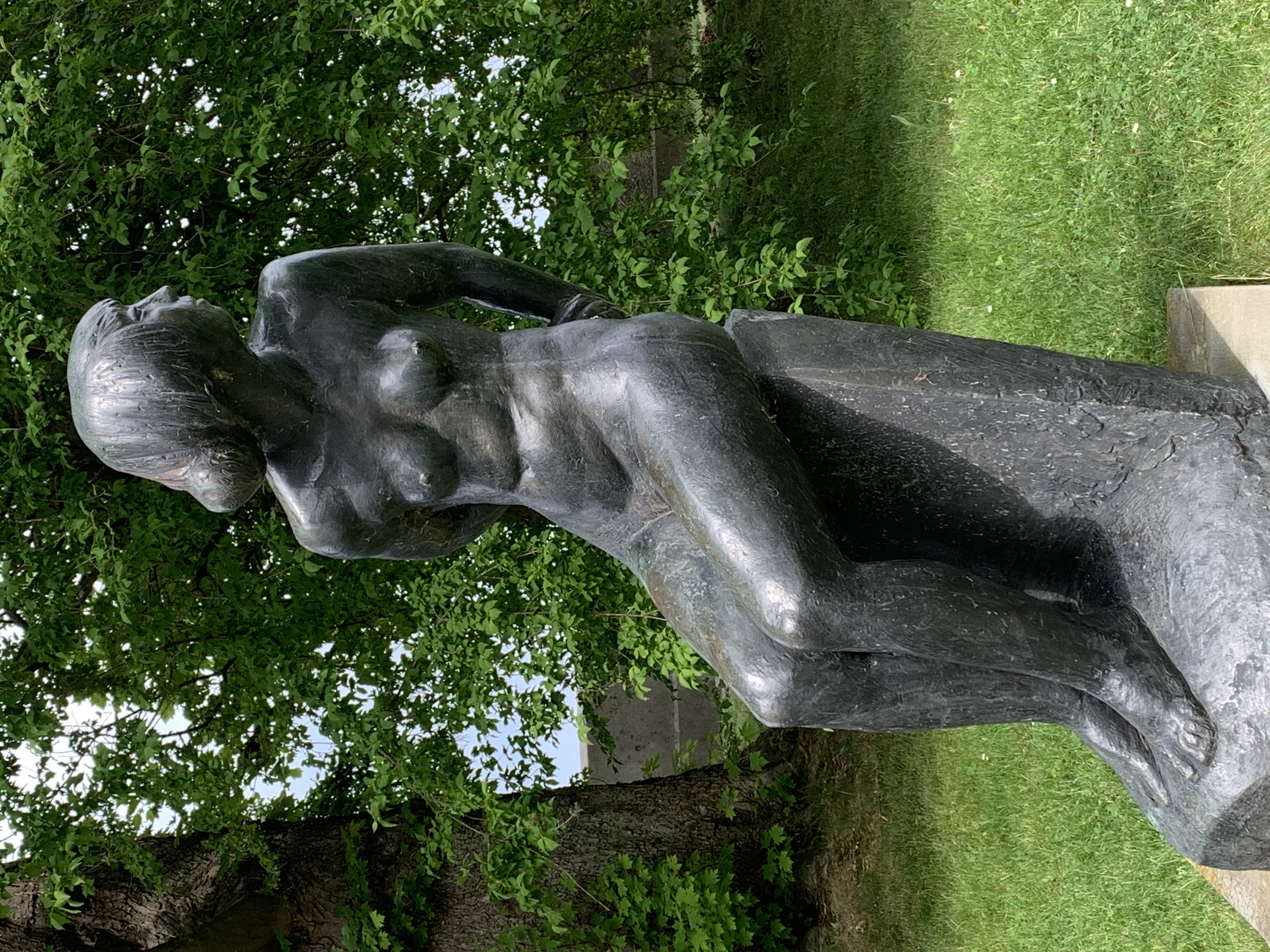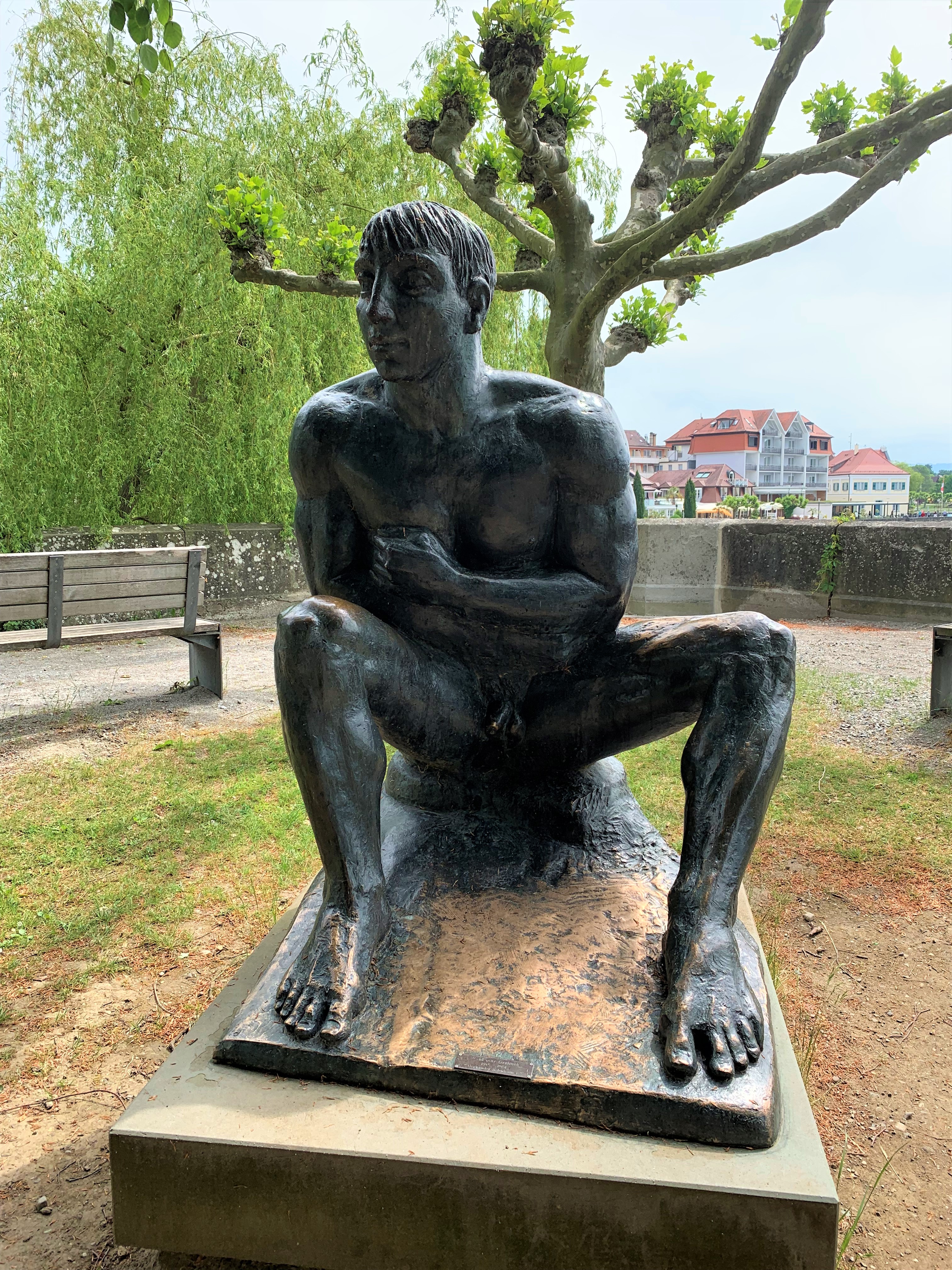 Als wäre er gerade eben dem See entstiegen, so hockt der Schwimmer des Künstlers Waldemar Grzimek im Garten vor dem Schloss Montfort. Einducksvoll springen die Muskeln des ruhenden Jünglings hervor, herausgearbeitet aus der Bronze. Die Figur Hockender Schwimmer ist eine Dauerleihgabe des Künstlers an die Gemeinde Langenargen. Der Gemeinde war der Bildhauer durch seinen Vater, Günther Grzimek, sehr verbunden. Dieser war ein begeisterter Kunstsammler, aus dessen Sammlung die Gemeinde im Jahr 1983 insgesamt 25 Gemälde gekauft hatte, die heute auf Schloss Montfort zu sehen sind.