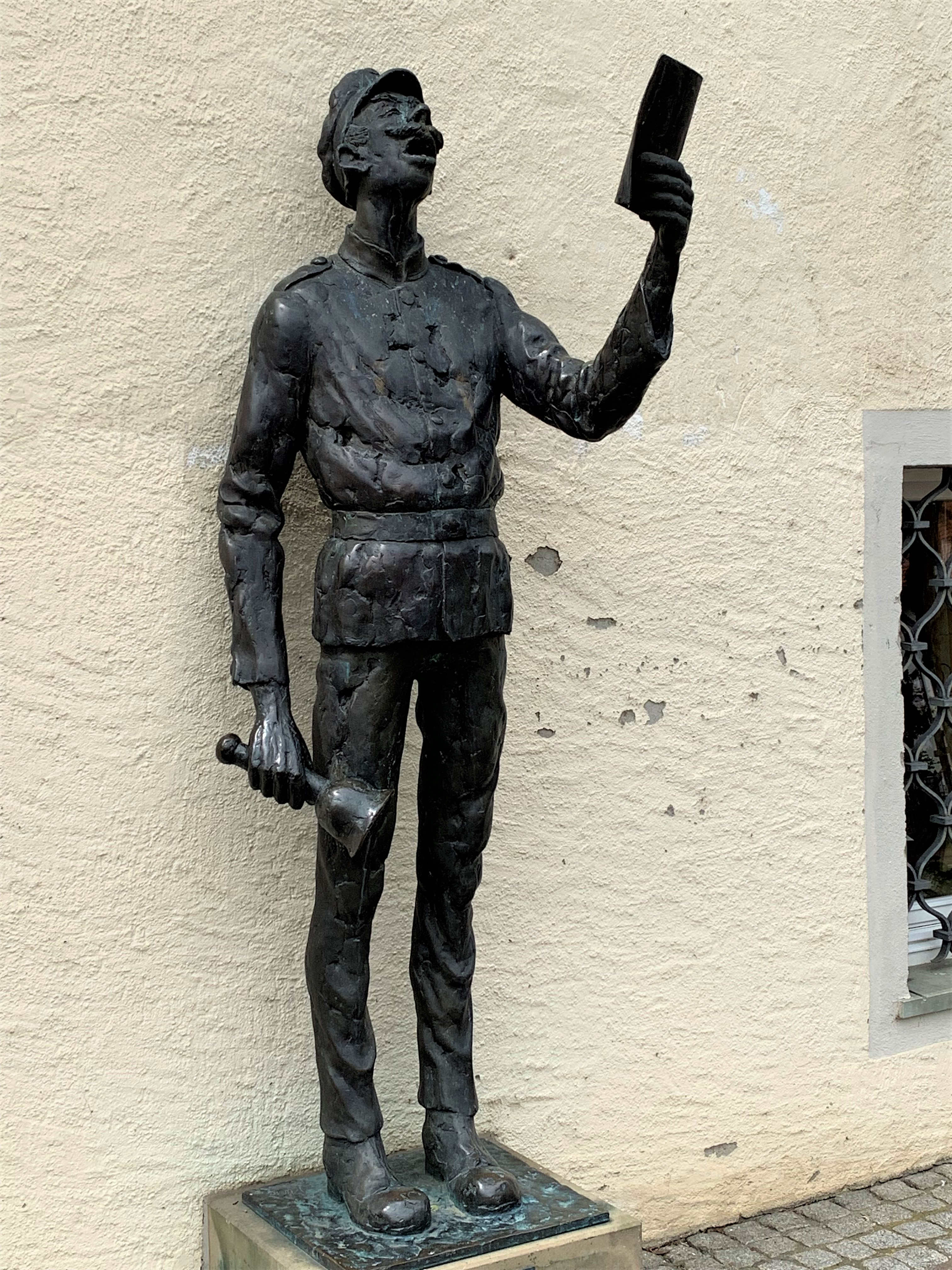 Vor dem Hospital zum Heiligen Geist befindet sich die imposante, bronzene Figur des Büttels. Dass der Büttel ein wichtiger Mann ist, der den Bürgern die "Schlagzeilen" des Tages verkündet, kann der Betrachter an der hochgereckten Hand und der Schelle ablesen. Traditionell stand der Büttel bei seinen sonntäglichen Bekanntmachungen zwischen dem Hospital und der Kirche in Langenargen. Die Bronzefigur von Roland Martin ist nicht nur eine Erinnerung an die gute alte Tradition des Büttels, des "amtlichen Ausschellers" im Allgemeinen, sondern auch an deen letzten Büttel in Langenargen, Georg Wengert. Der "Schelle-Wengert", wie er im Volksmund hiess, schwang bis in die Sechzigerjahre hinein seine Schelle und verkündete die Nachrichten. Die Bronzefigur von Künstler und Bildhauer Roland Martin steht seit 1989 am Hospital.