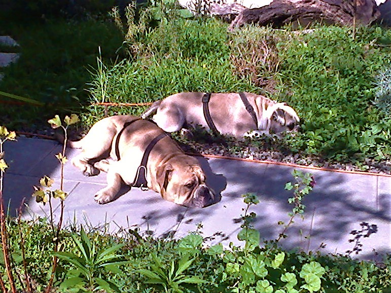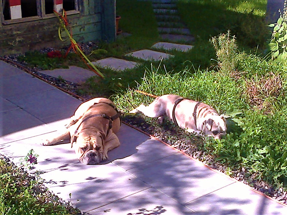 Diese beiden, auf Herrchen (oder Frauchen) wartenden Englischen Bulldoggen, machen in der warmen Septembersonne liegend, einen sehr entspannten Eindruck. Was in ihren Köpfen wohl vorgeht? Ist den beiden etwa langweilig, oder dösen sie einfach - vom Laufen ermüdet - vor sich hin? Wie auch immer, sie scheinen das perfekte Relaxen zu ihrem Hobby gemacht zu haben.
