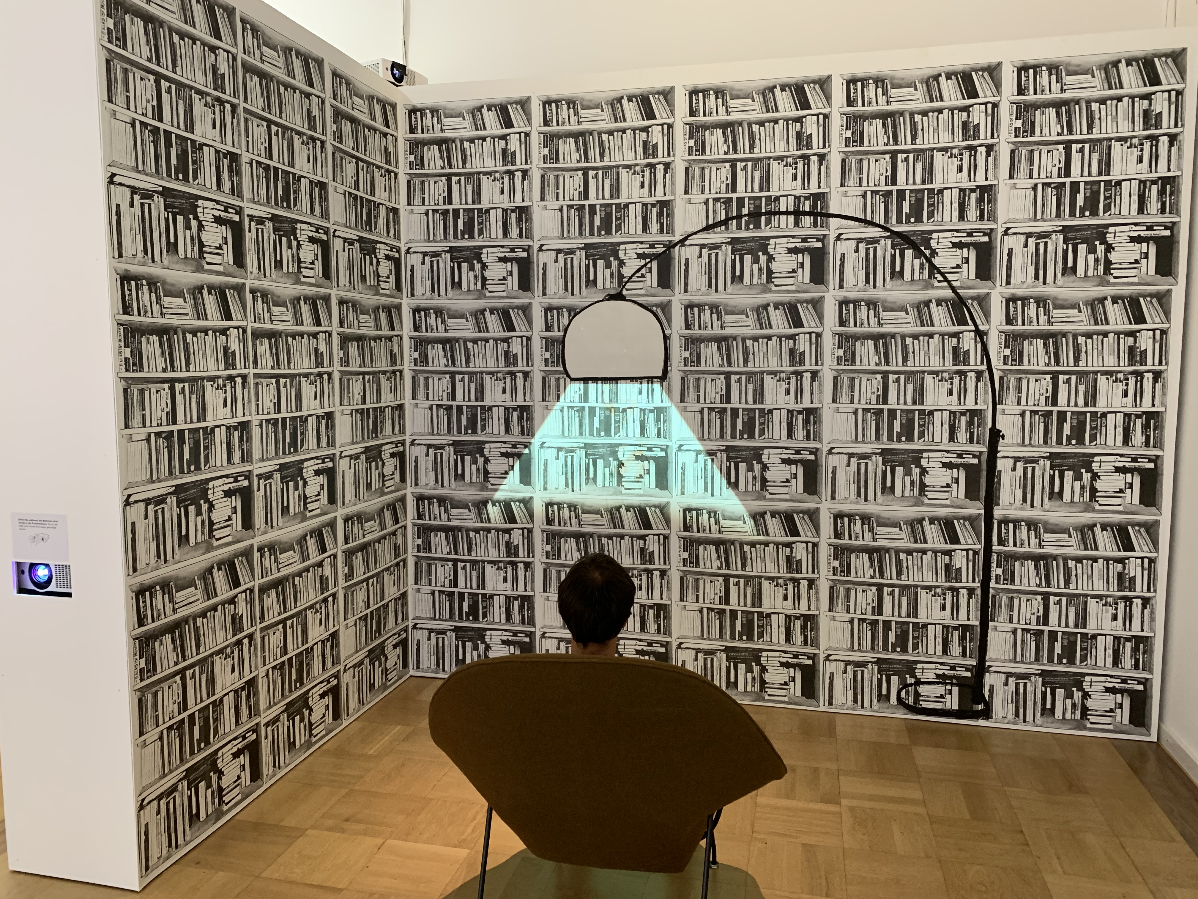 Das Bücherregal besteht aus rund 24 Steindrucken des Formats 100x70 cm, die in Zusammenarbeit mit der Steindruckerei Wolfensberger entstanden und vor Ort von der Künstlerin durch zeichnerische Eingriffe ergänzt wurden. Das Verfahren des Steindrucks wurde Ende des 18. Jahrhunderts erfunden und ermöglichte fortan, farbige Drucksachen in grösserer Auflage zu drucken. Leutenegger hat in diesem Flachdruckverfahren ein Motiv entworfen, das zu allen Seiten hin beliebig erweiterbar ist. So ist es möglich, aus dem Ausschnitt eine ganze Bibliothek entstehen zu lassen. Bei dem Motiv handelt es sich um einen Ausschnitt des Bücherregals in der Wohnung der Künstlerin - ein kleiner versteckter Einblick in ihre Privaträume.
