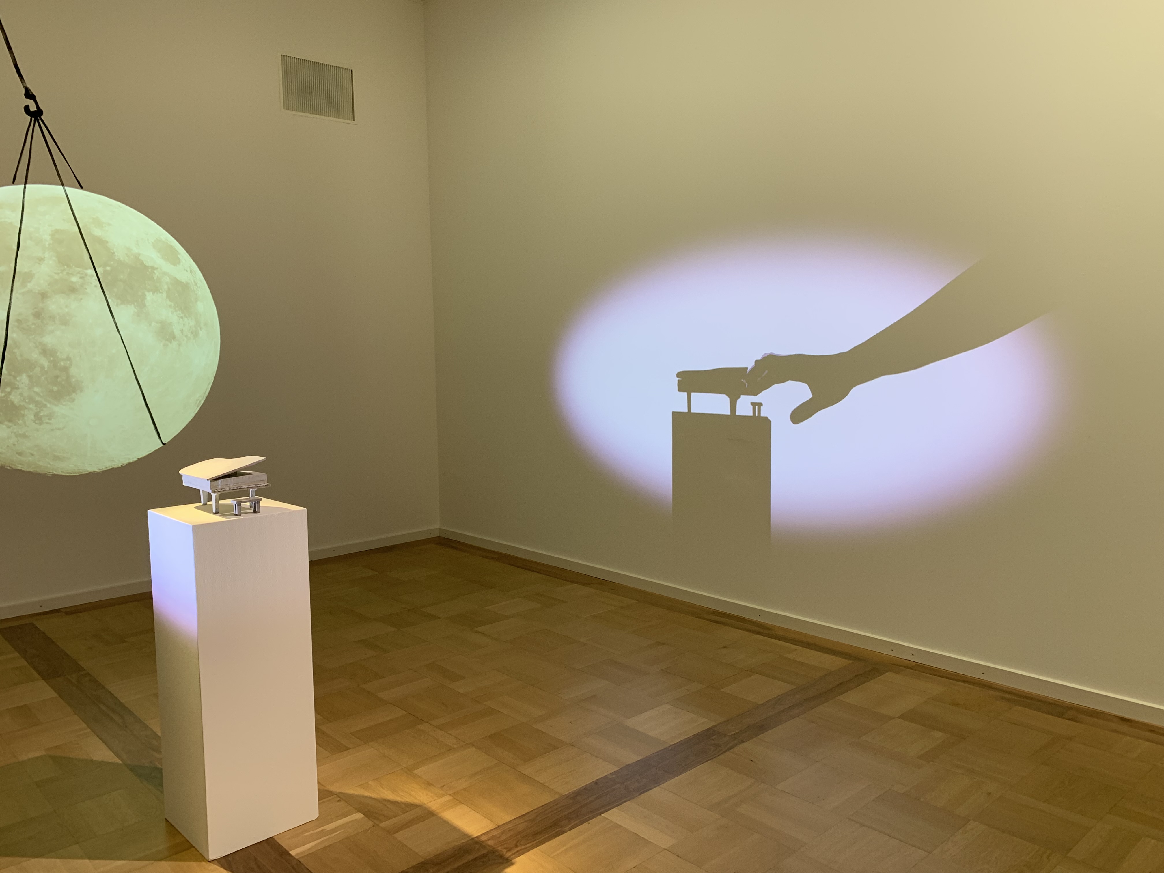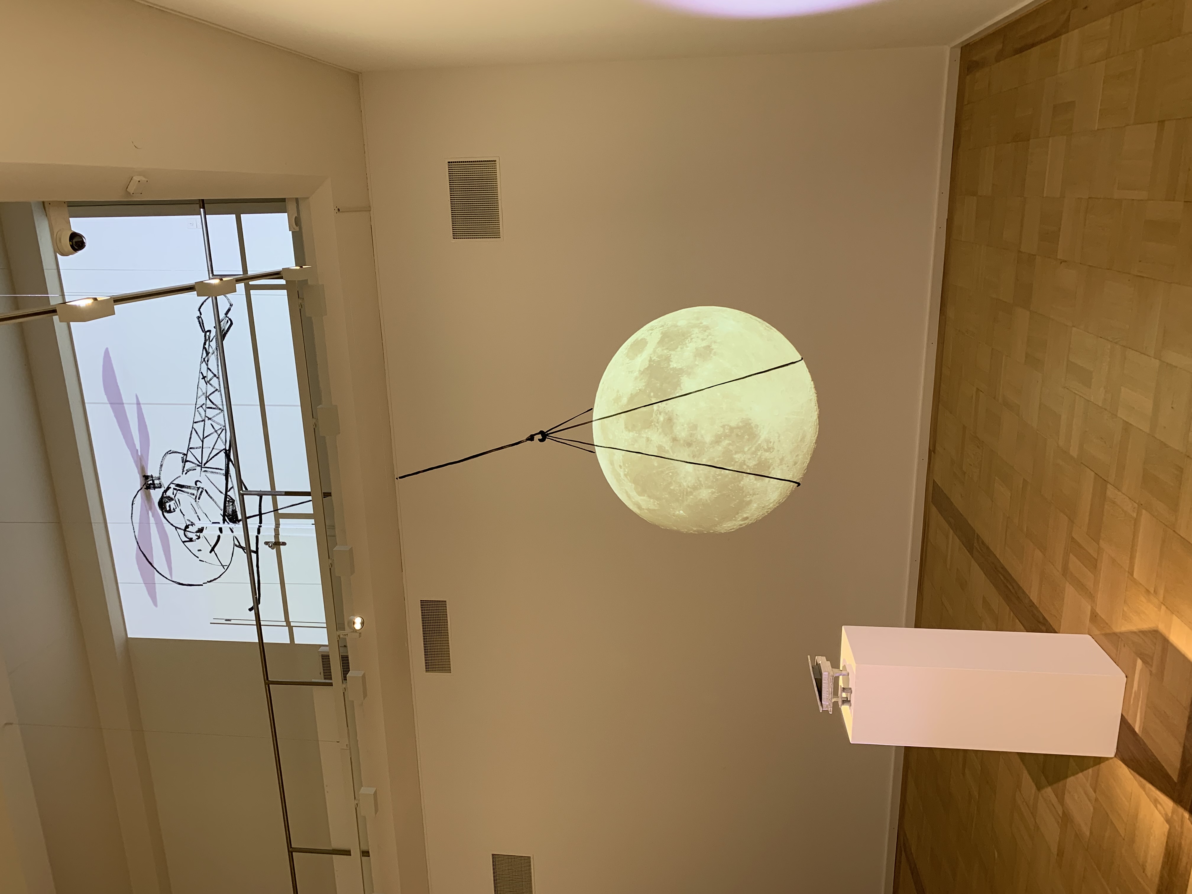 Nebenan schwebt ein Mond in das angedeutete Wohnzimmer. Er ist an Seilen befestigt und wird von einem Helikopter getragen. Auf dem Weg wurde er in eine greifbare Grösse gebracht und so zum Spielkameraden eines Schattenkindes, das ihn wie einen Ball an einem Pendel hin- und herwandern lässt: Ein Freund aus der Ferne, leuchtend und schön. Der Mond - ein Motiv, das bei Leutenegger immer wieder auftaucht. Ein Sehnsuchtsort in der Ferne, der seit 1998 zum zentralen Thema mehrerer Werke wurde. Das bekannteste ist wohl die Videoarbeit "Der Mann im Mond" (2020), in dem die Künstlerin fiktiv in einen Krater des Mondes pinkelt. Nun geht die Reise nicht zum Mond, sondern er kommt in das Wohnzimmer. Zu Besuch, wie der Titel des Werks vermuten lässt.