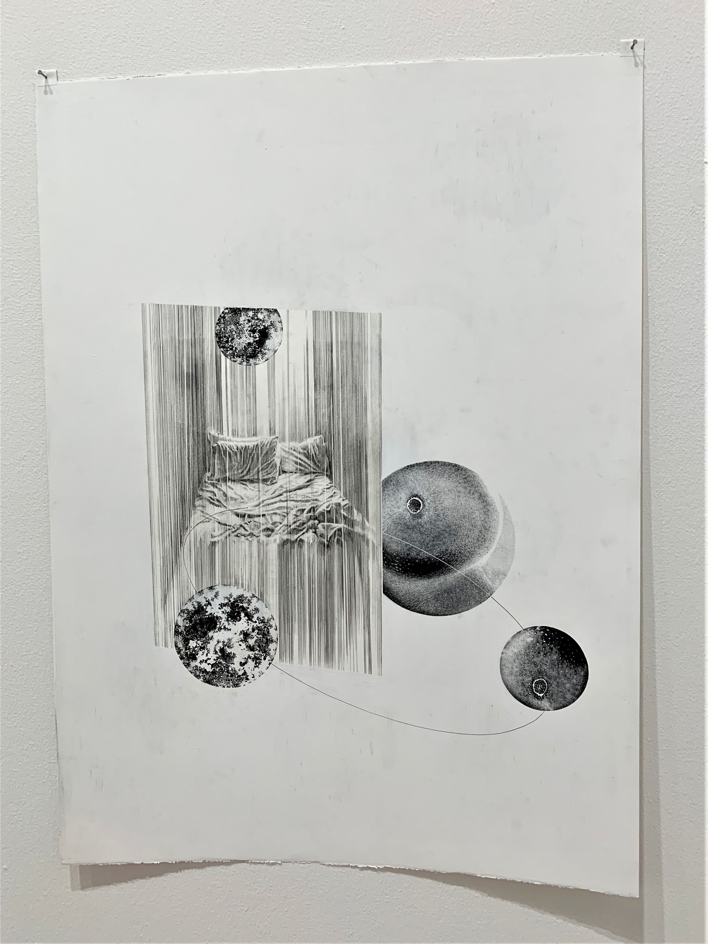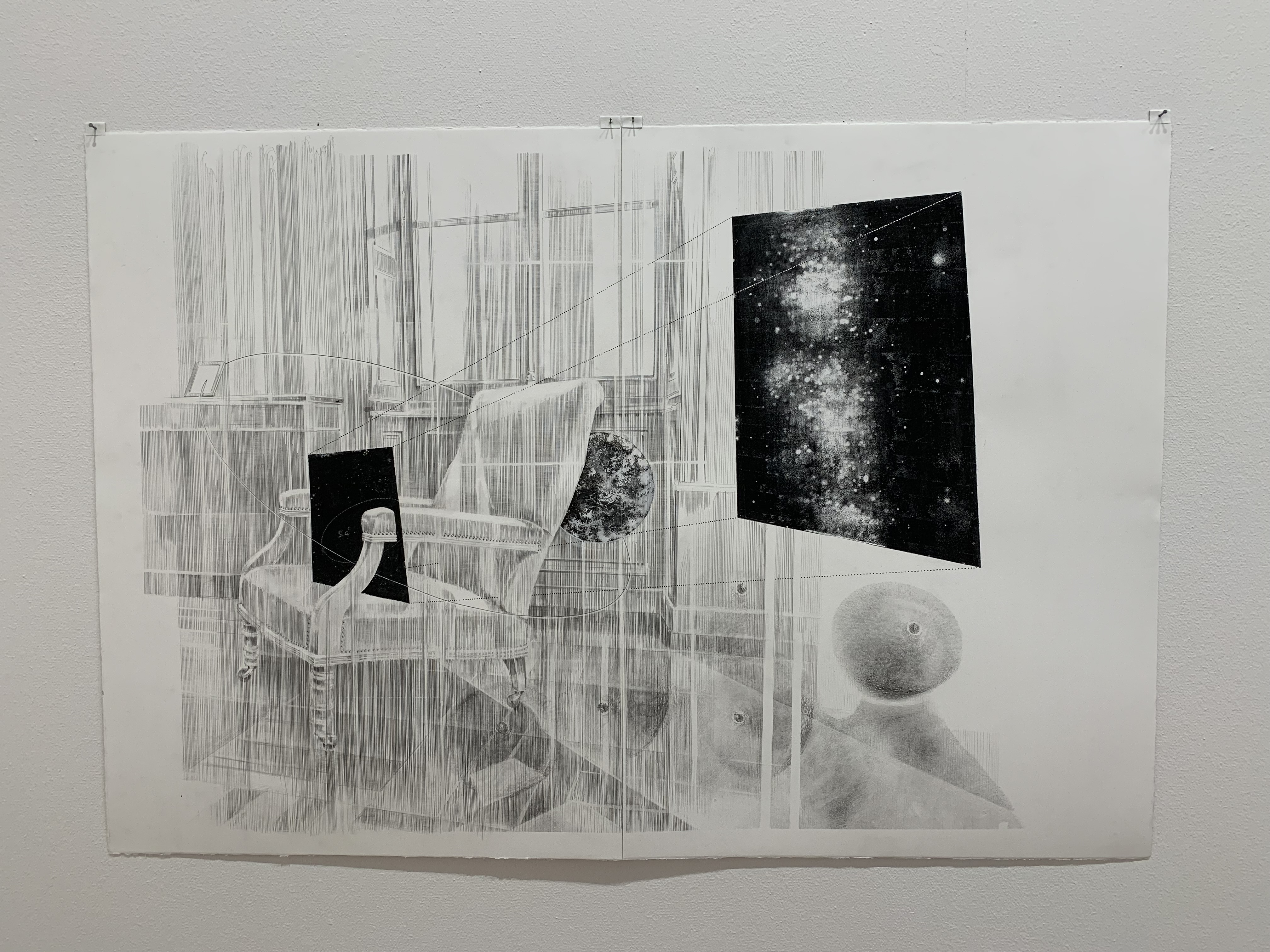 Sandra Boeschensteins Ausstellungsbeitrag startet mit einem Arrangement, bei dem sie selbst von einem "Driften" zwischen den Elementen spricht. Zeichnung und Raum, Illusion und Realität werden hier eng zusammengeführt: eine gezeichnete Wolke geht in ein Loch über, dieses Loch ist sowohl Teil der Zeichnung als auch physisch vorhanden. Es erweitert die Bildebene in die Tiefe. Boeschenstein führt das Werk auf der anderen Seite der Stellwand übereck fort. Das Loch in der Stellwand wird auf der Aussenwand des Raums wieder aufgegriffen. Dadurch entsteht eine zeichnerische Konstellation, bei der das Zusammenspiel aus Objekten, Zeichnungen und einer räumlichen Erweiterung zu einem mehrschichtigen Seherlebnis führt. Auf der Rückseite klaffen weitere Löcher in der Wand, münden jedoch in keinen Durchblick. Versteckt sich hier gar ein kleiner Mond in den Weiten der Stellwand?