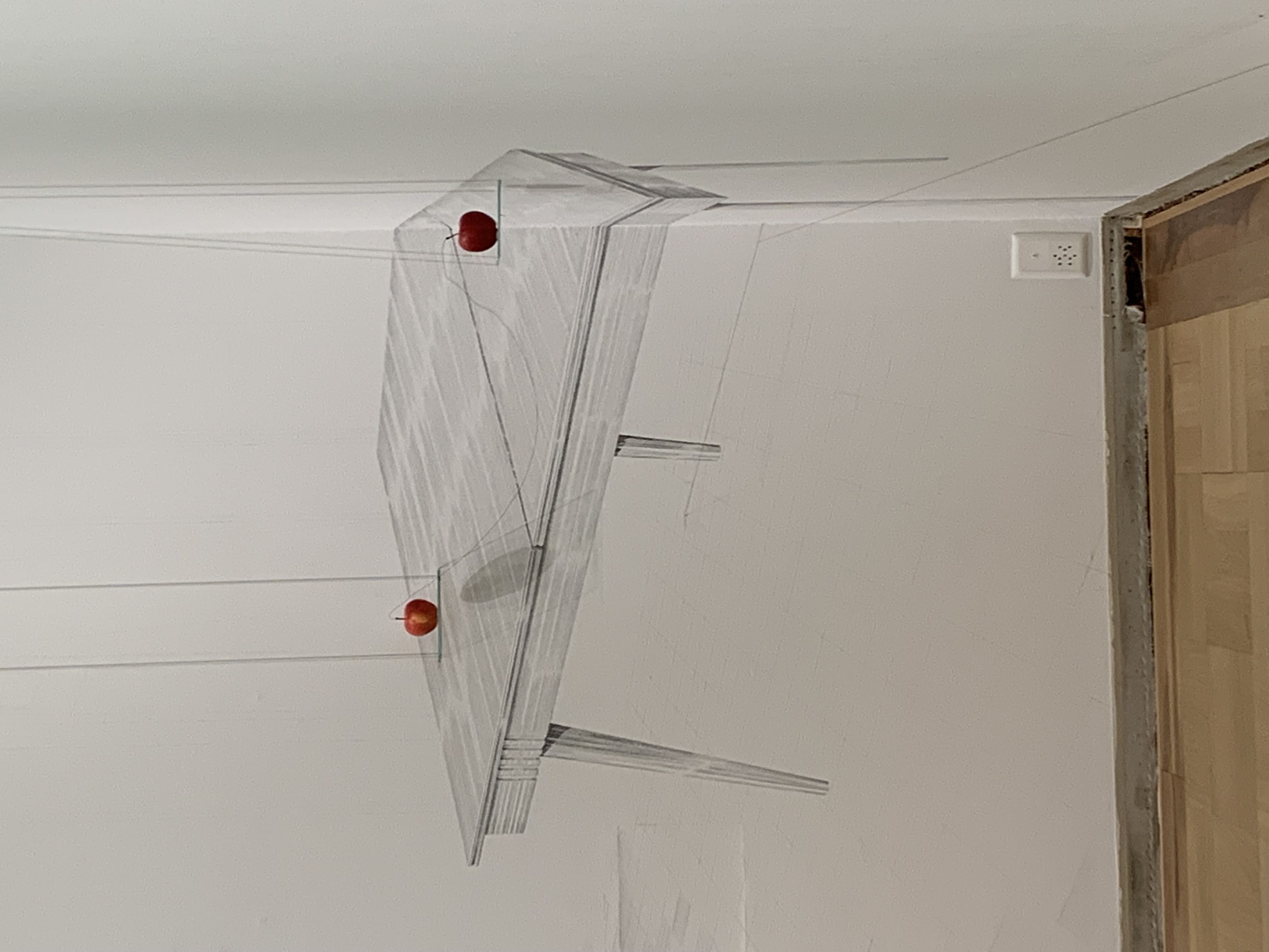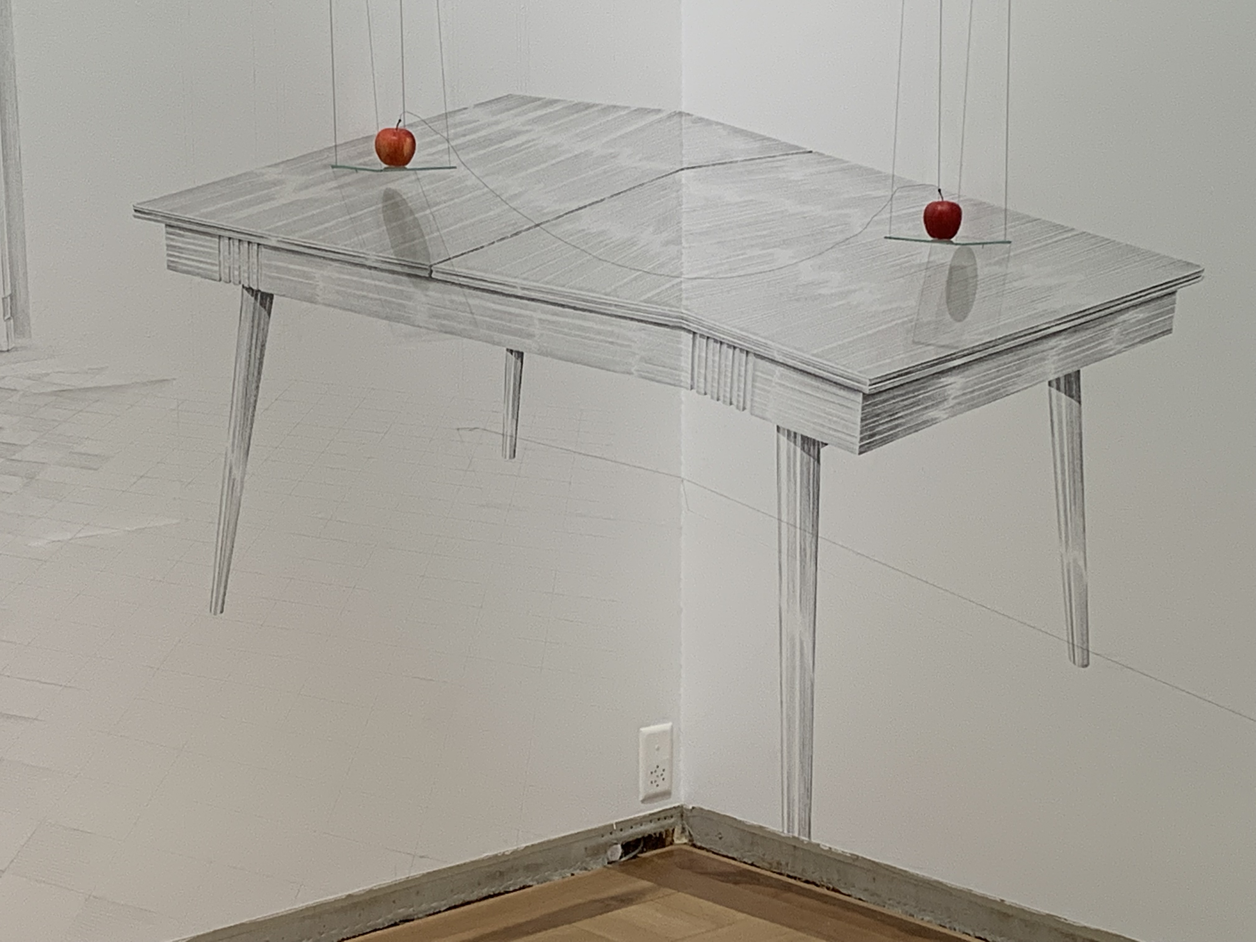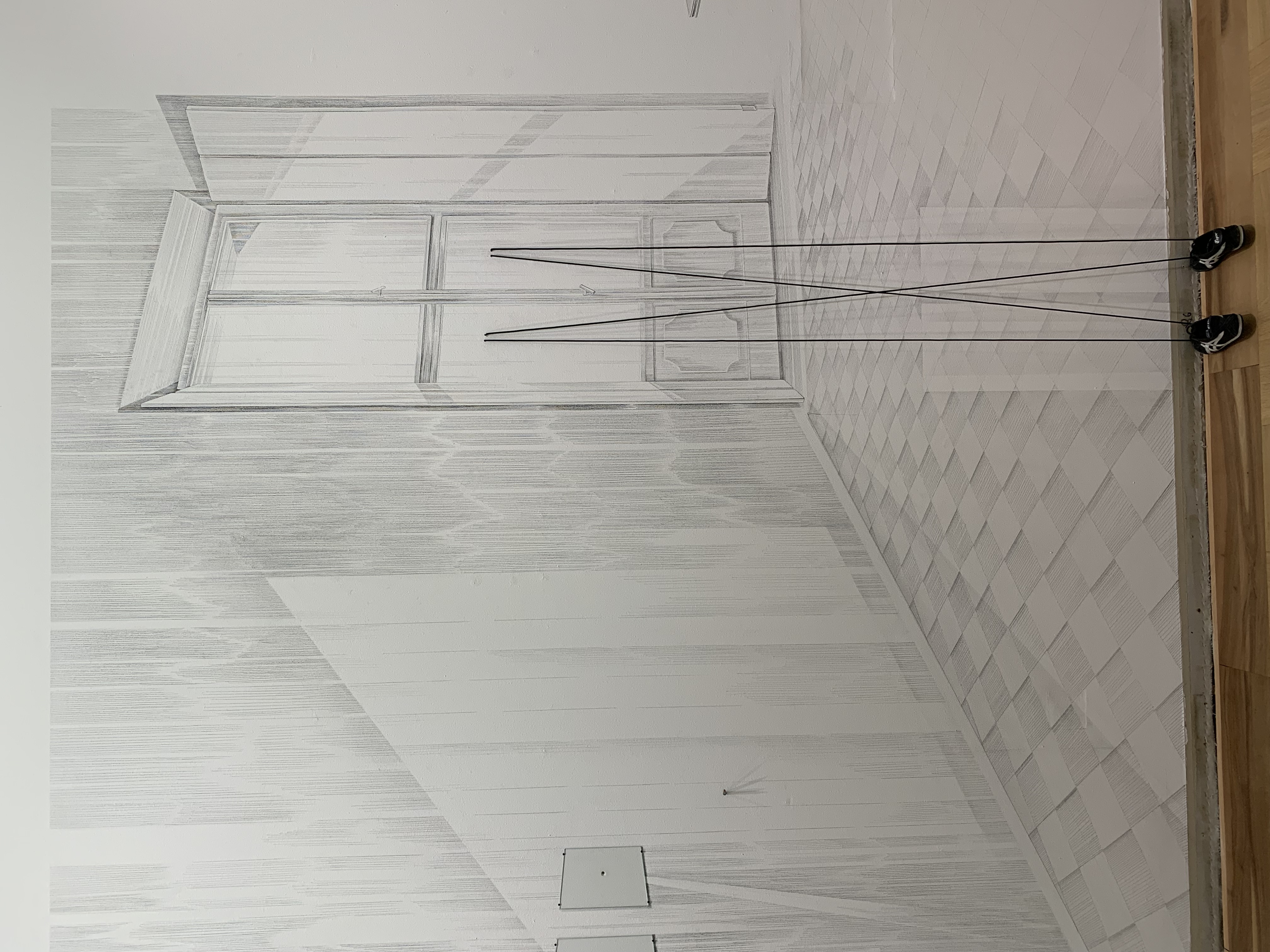 Die Auseinandersetzung mit dem menschlichen Sehen wird auch beim Betrachten des Tisches deutlich, der in die Ecke des Raums gezeichnet wurde. In einer unverkennbaren Kombination aus Zeichnungen, Fäden und Objekten entwickelte die Künstlerin hier ein Setting, das je nach Blickwinkel perspektivisch stimmig erscheint oder in einzelne, unzusammenhängende Teile zerfällt. Während die Perspektive der dreidimensionalen Objekte vom Auge stets angepasst wird, bleibt die Zeichnung perspektivisch starr. Das Element der Schatten taucht hier erneut auf und ergänzt das Arrangement um eine weitere Abstufung zwischen realem Objekt und illusionistischer Zeichnung. Boeschenstein operiert - um es mit ihren eigenen Worten zu sagen - mit dem "fliessenden Vermitteln zwischen unterschiedlichsten Realitätsfragmenten im Wahrnehmungsakt". Eine Fähigkeit, die aus Sicht der Künstlerin auch in unserem Alltag zunehmend gefordert wird.