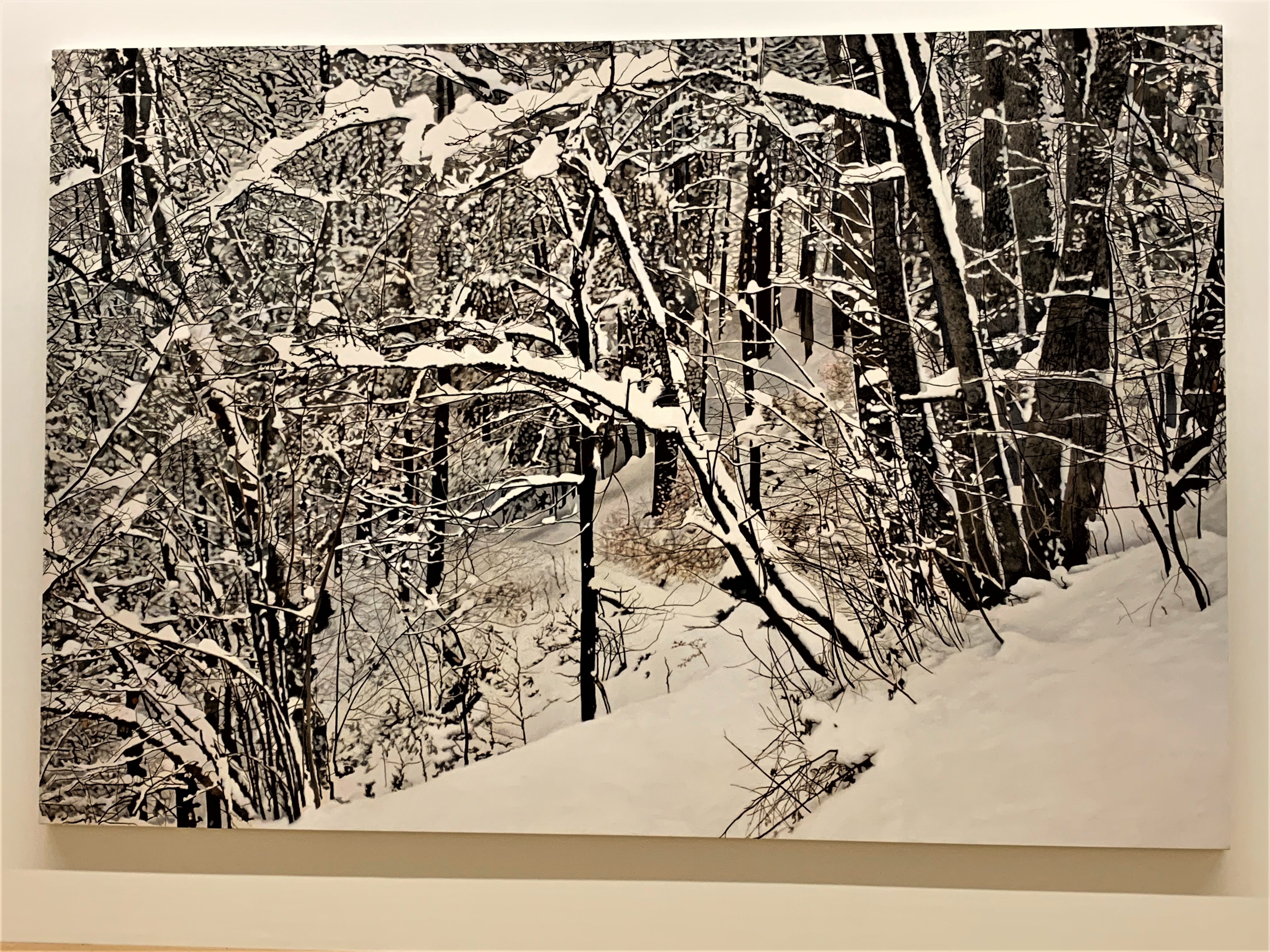 Bei "Winter" (2009) ist es kein sommerlicher Blätterwald, der dem Betrachter entgegentritt, sondern ein verschneites Waldstück am Morgen, das den Betrachter aufnimmt. Bäume, Äste und Zweige, gestaltet mit fein schattierten Brauntönen, überziehen netzartig die Oberfläche des Werks; der Schnee ist überall und verstellt doch den Blick auf die Natur nicht. Einige Äste tragen eine Schicht aus Schnee, die rechte untere Ecke erscheint zunächst ganz weiss. Betrachtet man das Gemälde aus der Nähe, wird das Gefühl des frisch gefallenen Schnees beinahe greifbar. Franz Gertsch ist es gelungen, mit feinsten Farbabstufungen die weisse Landschaft zu strukturieren und dem Betrachter die pudrig-zarten Eigenschaften des Schnees zu vergegenwärtigen.