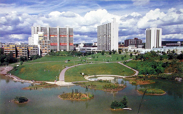 Wir Schüler der Fachrichtungen Baumschule/Stauden, Produktion und Landschaft hatten im Rahmen des Deutschunterrichtes den Auftrag, in Gruppen eine Reise und Fachdokumentationen zusammenzustellen. Verschiedene Themen wurden uns zur Bearbeitung vorgeschlagen. Eine kleine Auswahl dieser Erlebnisberichte wurde im Jahrbuch GSO 1984 wiedergegeben. Unsere Gruppe Baumschule/Stauden und Landschaft wurde vom vorzüglichen Chauffeur der ehemaligen Firma Dähler Carreisen durch den Schwarzwald über Tübingen nach Stuttgart gefahren, wo der erste Besuch dem botanisch-zoologischen Garten Wilhelma galt. Am anderen Tag wurden wir durch Professor Hans Luz in die Grüne Stadtmitte von Leonberg geführt. Und es war eben mein Thema, die damals aktuelle Situation zu beschreiben - und ich bin heute noch stolz darauf, dass mein Bericht als einziger in ganzer Länge abgedruck wurde; das war nämlich alles andere als selbstverständlich. Ach ja, unser Fachlehrer für Gartenbau und Gartentechnik, Martin Mathys, schaute sich bei unserem Besuch auf der Baustelle des künftigen Stadtparks verzweifelt nach einem Schüler um, der sich mit einer Schreibtafel ausgerüstet, eifrig Notizen machen würde. (Er wusste nicht mehr, wer den Auftrag für den Bericht erhalten hatte). Und mir war eben nicht anzusehen, dass ich mir meine Notizen fortwährend im Kopf abgespeichert hatte. Dafür machte ich eifrig Diapositive, die heute noch vorhanden sind. Aber jetzt geht's hier los:
