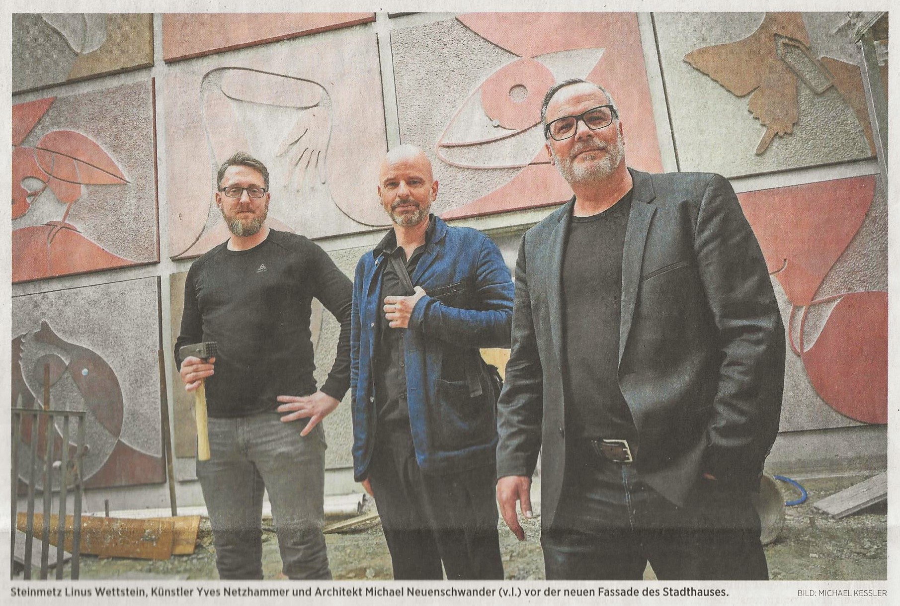 Am Mittwoch fand sich der Künstler Netzhammer zu einem Gespräch mit Katharina Epprecht ein, ihres Zeichens Noch-Direktorin Museum zu Allerheiligen und Jurymitglied. Vor der Fassade des Stadthauses sprachen die beiden über sein Werk, das eine Jury aus 150 Bewerbungen ausgewählt hat. Kleine Rückblende: 2021 schrieb die Stadt Schaffhausen den Ideenwettbewerb "Kunst am Bau" für die Gestaltung des Stadthauses aus, im November und Dezember 2023 wurden die vorgefertigten Betonelemente angeliefert und montiert. Der Steinmetz Linus Wettstein hat die Zeichnungen des in Schaffhausen aufgewachsenen Künstlers schliesslich in schweisstreibender Handarbeit gemeisselt.