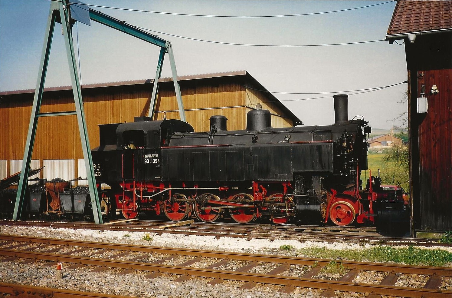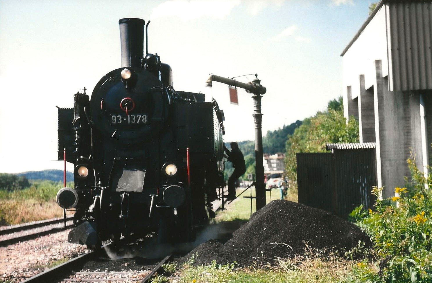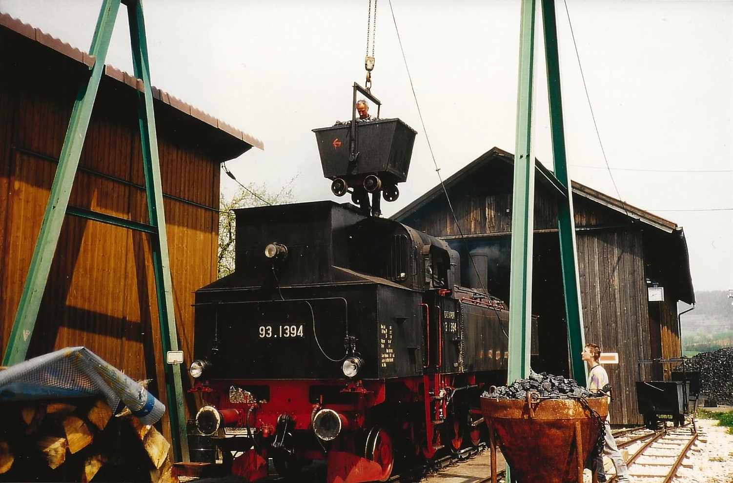 Die 1-D-1 Tenderlokomotive der BR 93-1394 (Baujahr 1939; Wien-Floridsdorf), bei der Bekohlung im BW Fützen. Der Heizerlehrling Martin Fluck hilft am Kohlekran dem altgedienten Lokführer Thomas Lexer (auf dem Führerhaus stehend). Leider brachte diese ebenfalls formschöne Maschine nicht immer die geforderten Leistungen, galt es doch oftmals, einen vollbesetzten 8-Wagen-Zug auf der Bergfahrt von Weizen nach Blumberg hochzuschleppen. Daher schied sie bereits in den 90er-Jahren aus den Diensten der WTB und wurde ins Kandertal (Baden), zur dortigen Museumsbahn überführt.