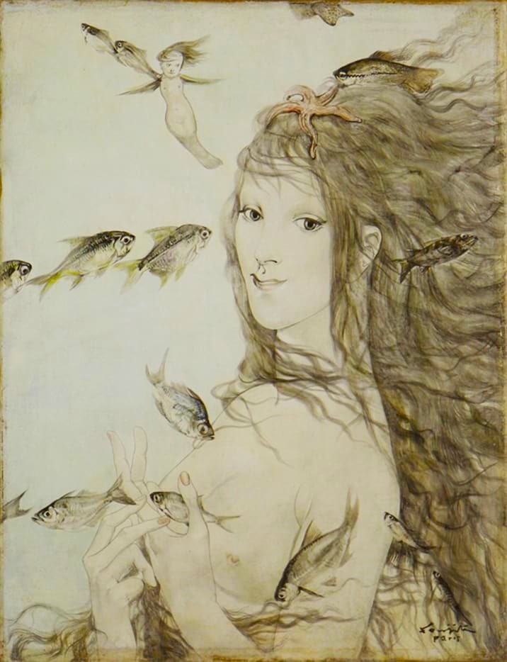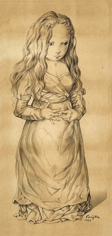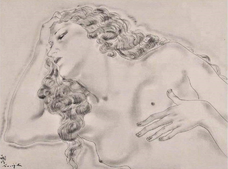 Foujitas unverwechselbarer Stil unterschied seine Arbeit sofort von der seiner Kollegen: Er verband traditionelle japanische Techniken mit europäischer Moderne. Er verzichtete auf die leuchtenden und dicken pastösen Farben, die seine impressionistischen Zeitgenossen bevorzugten, und wendete eine begrenzte Palette und präzise Konturen mit schwarzer Tinte an.