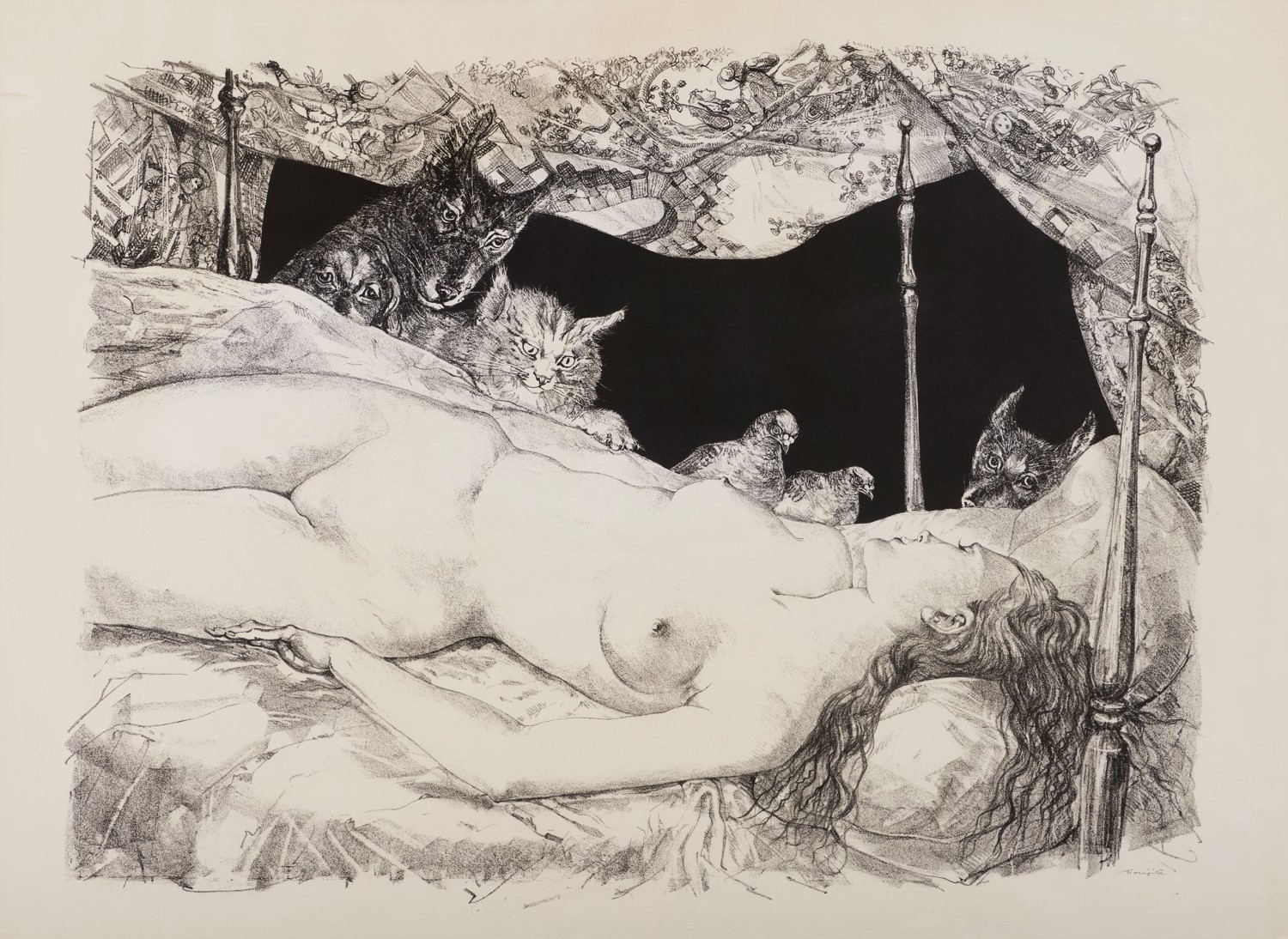 Auch Katzen hatten für Foujita eine bleibende Anziehungskraft und sind ein wiederkehrendes Motiv in seinem Werk. "Sie haben Anmut, Schönheit der Bewegung, faszinierende Trägheit", erklärte er 1935. Er studierte diese Eigenschaften im Laufe seiner Karriere in seinen Gemälden und Drucken, am Bekanntesten in "A Book of Cats". Dieses limitierte Buch wurde 1930 veröffentlicht und enthält 20 exquisite Radierungen des Lieblingstiers des Künstlers sowie Prosagedichte von Michael Joseph. Mit nur 500 gedruckten Exemplaren ist es ein äusserst begehrenswertes Werk.