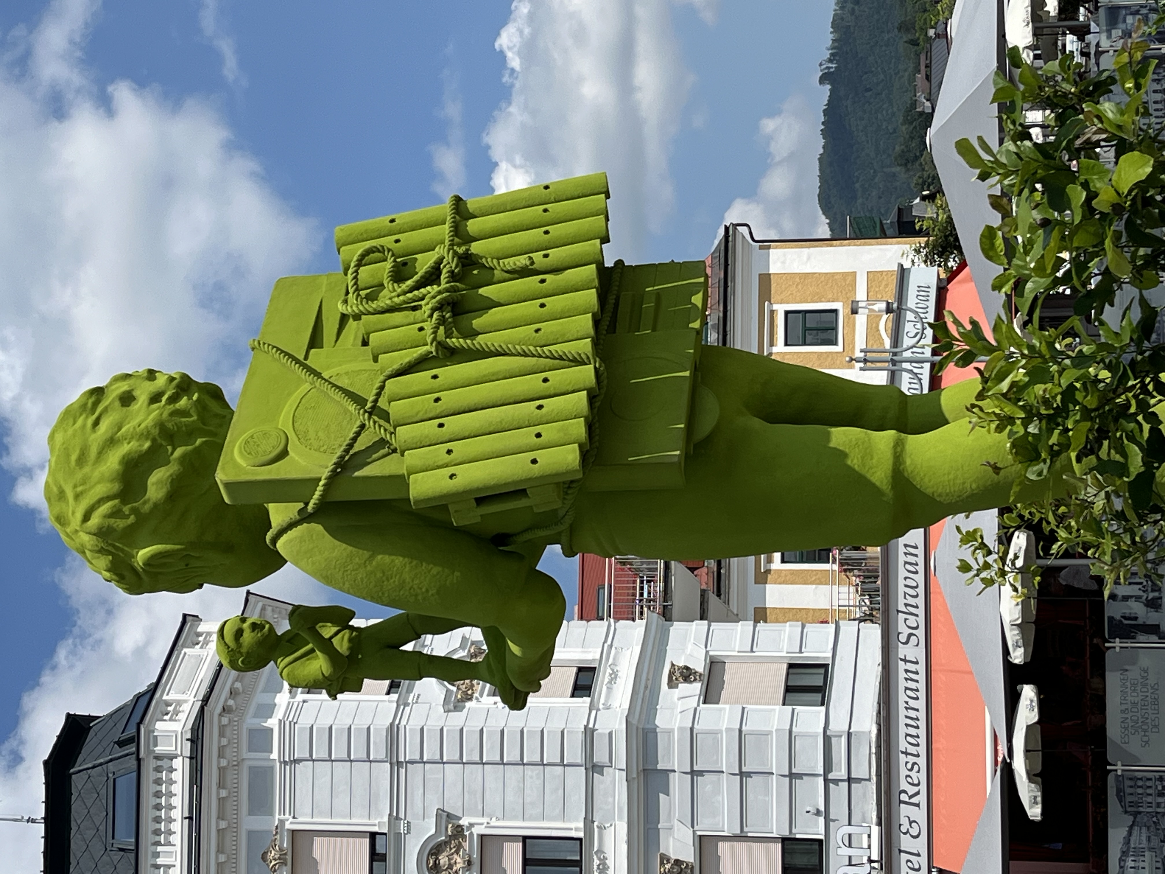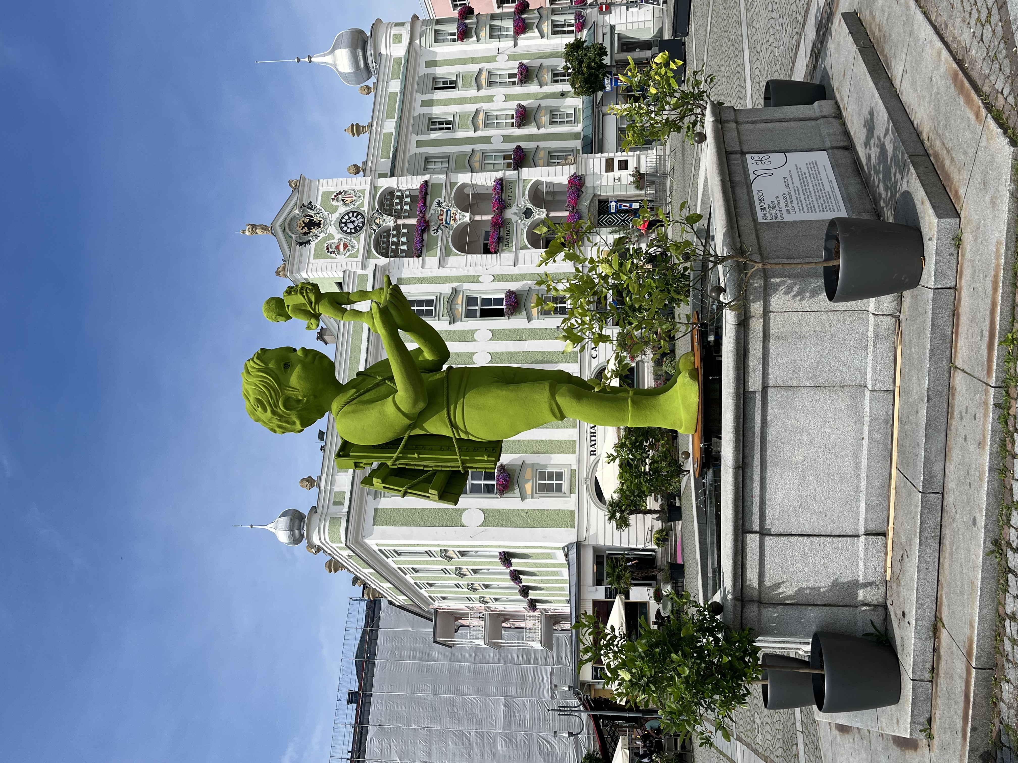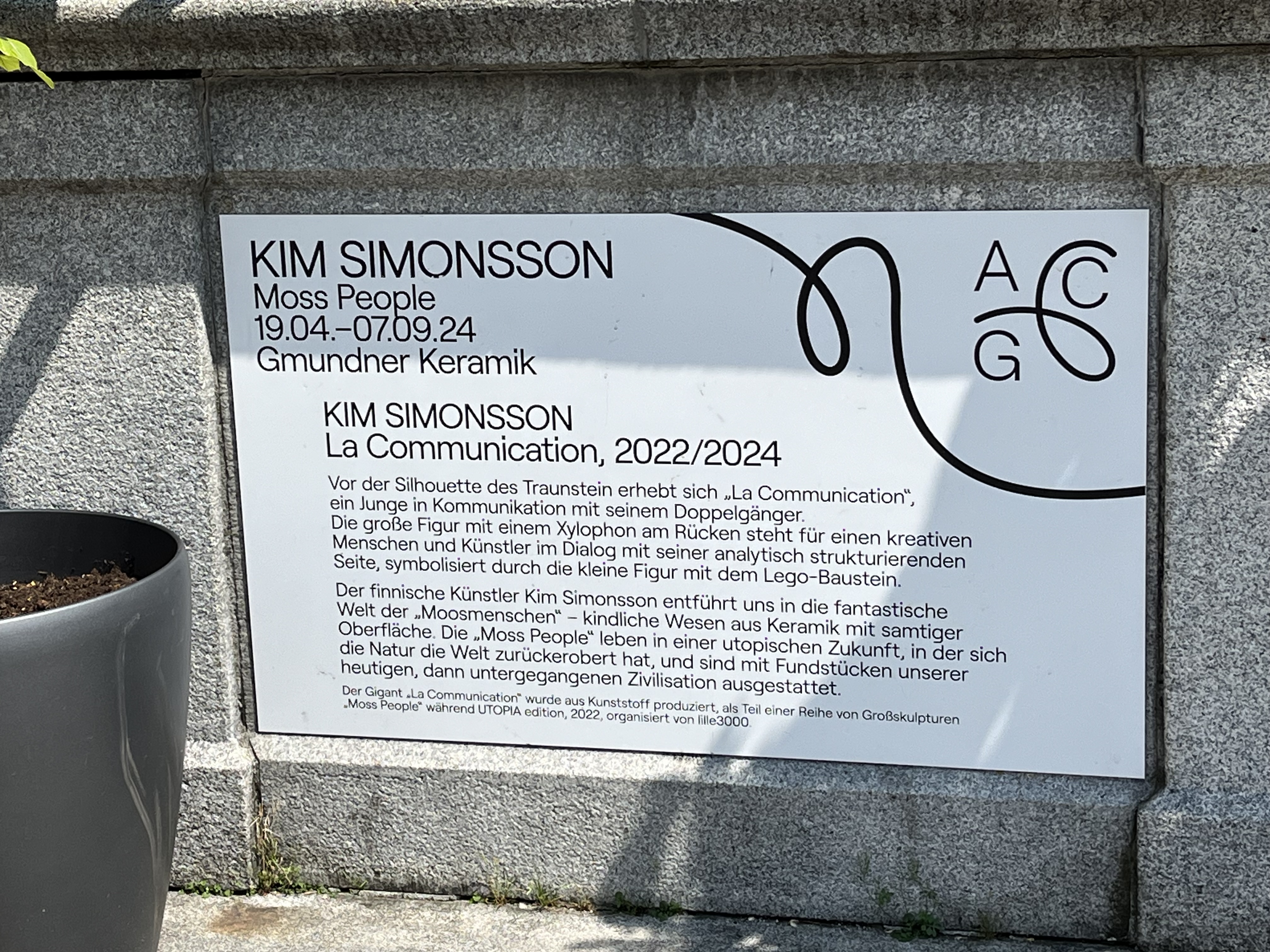 Vor der Silhouette des Traunstein erhebt sich auf dem Brunnen am Rathausplatz in Gmunden "La Communication", ein Junge in Kommunikation mit seinem Doppelgänger. Die grosse Figur mit einem Xylophon am Rücken steht für einen kreativen Menschen und Künstler im Dialog mit seiner analytisch strukturierenden Seite, symbolisiert durch die kleine Figur mit dem Lego-Baustein. Der Gigant "La Communication" wurde aus Kunststoff produziert, als Teil einer Reihe von Grossskulpturen für die Ausstellung "Moss People".