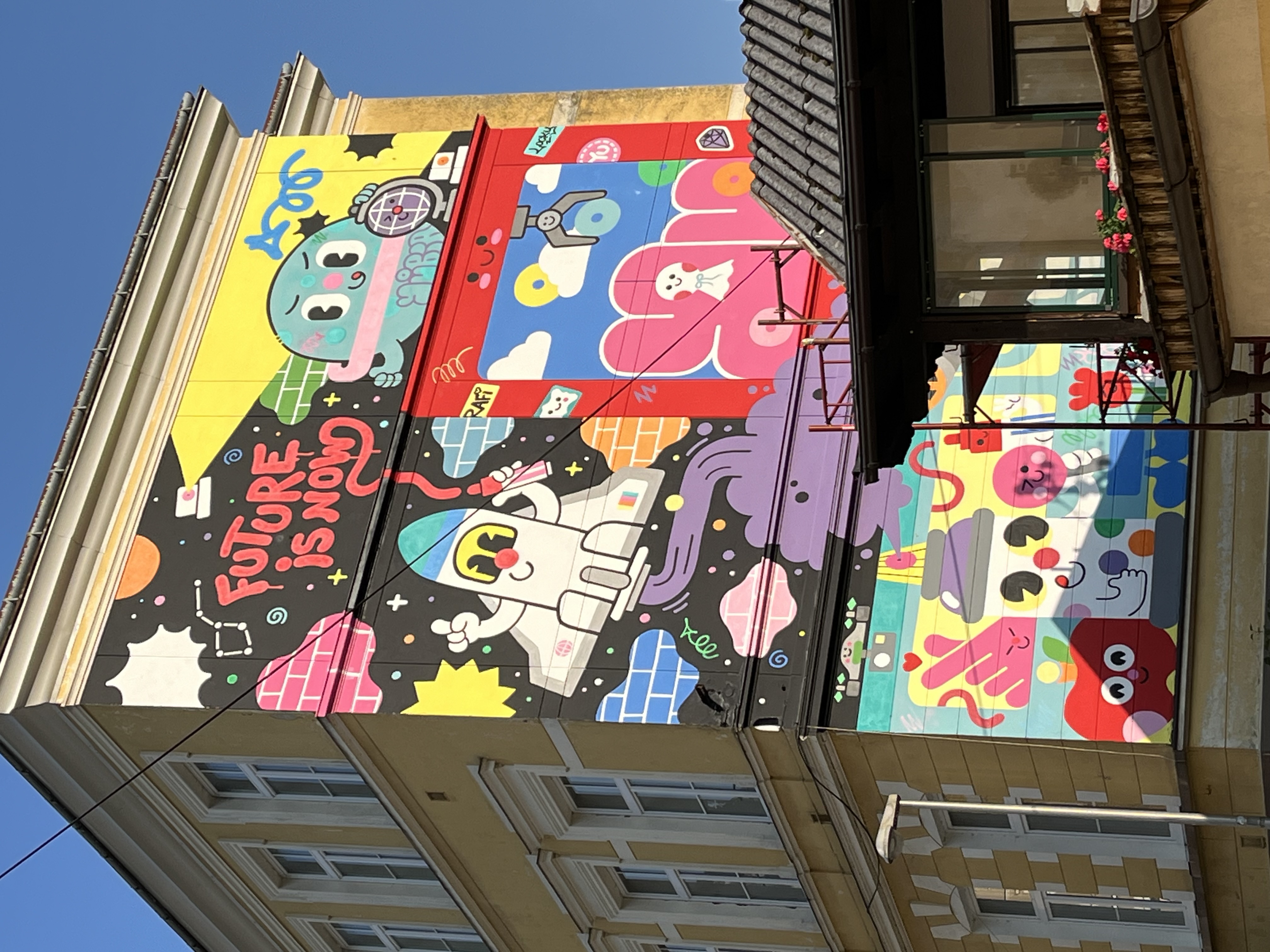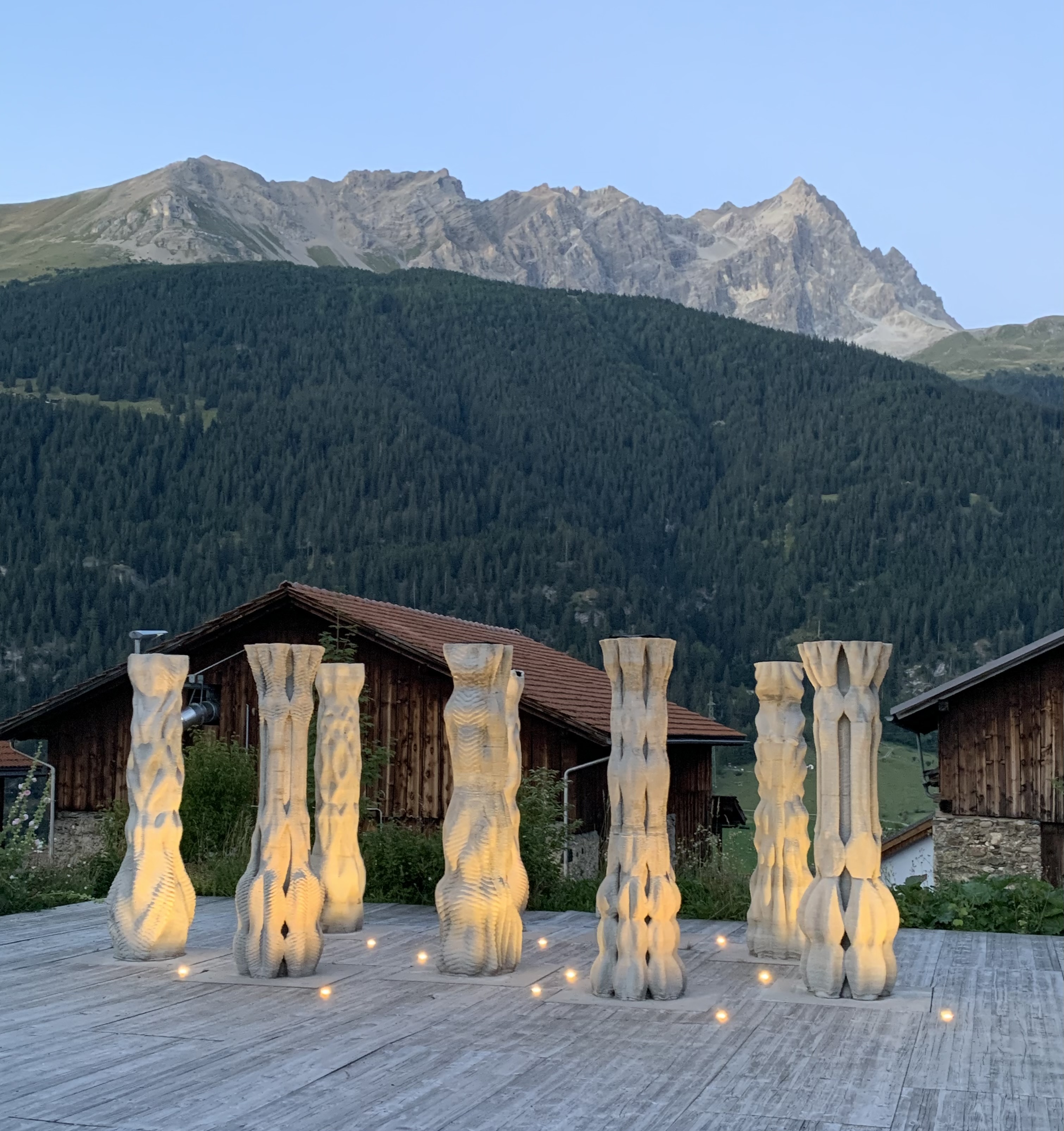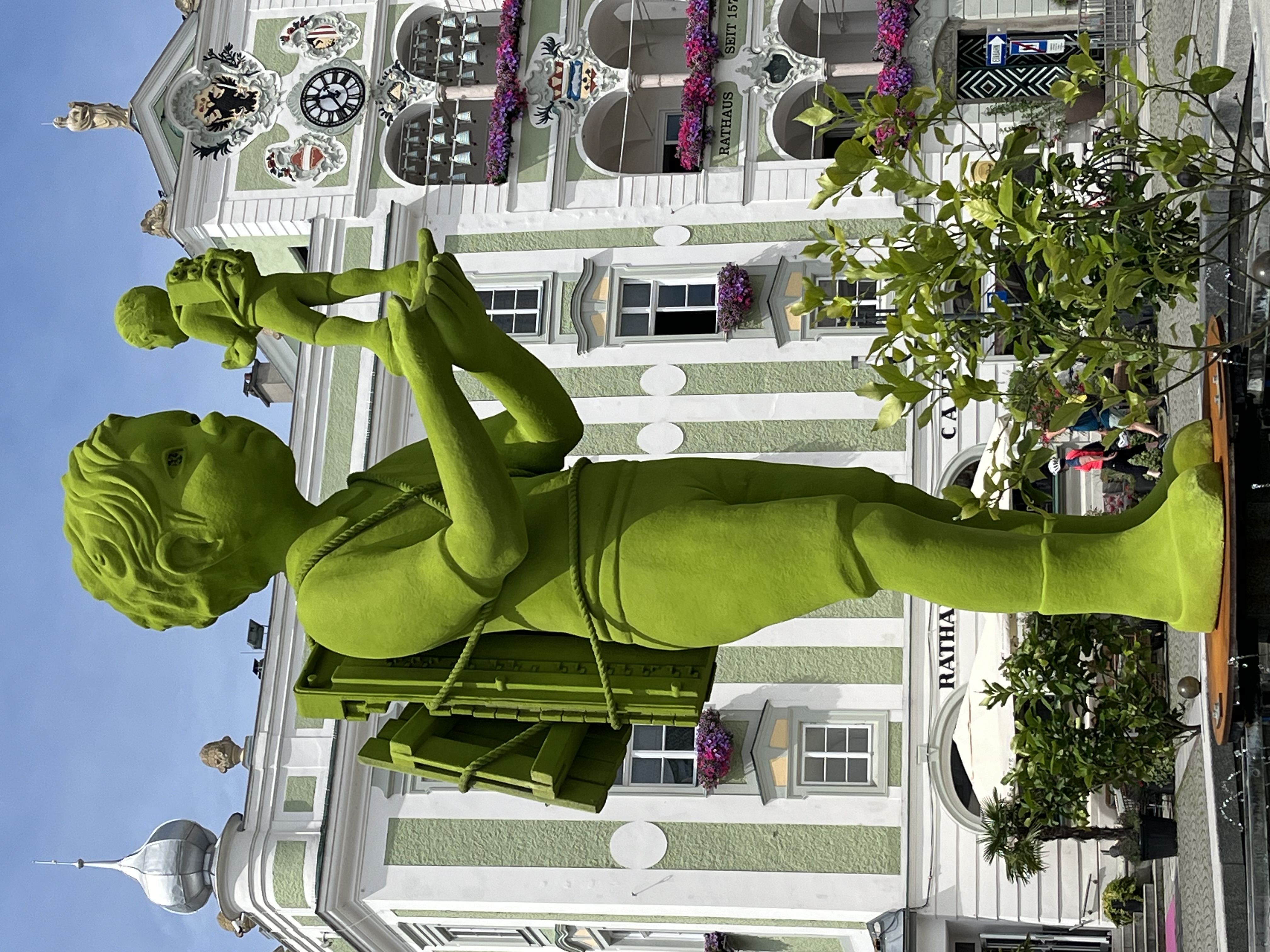 Vor der Silhouette des Traunstein erhebt sich auf dem Brunnen am Rathausplatz in Gmunden "La Communication", ein Junge in Kommunikation mit seinem Doppelgänger. Die grosse Figur mit einem Xylophon am Rücken steht für einen kreativen Menschen und Künstler im Dialog mit seiner analytisch strukturierenden Seite, symbolisiert durch die kleine Figur mit dem Lego-Baustein. Der Gigant "La Communication" wurde aus Kunststoff produziert, als Teil einer Reihe von Grossskulpturen für die Ausstellung "Moss People".