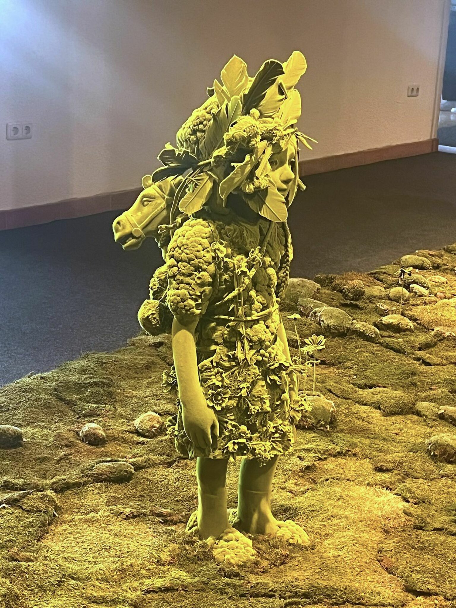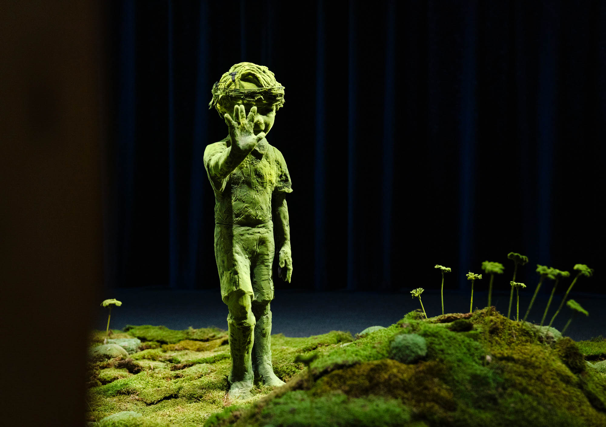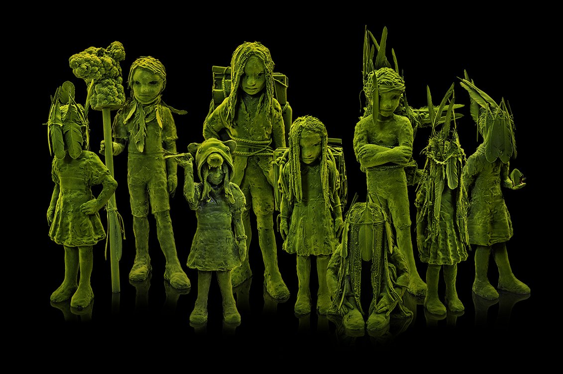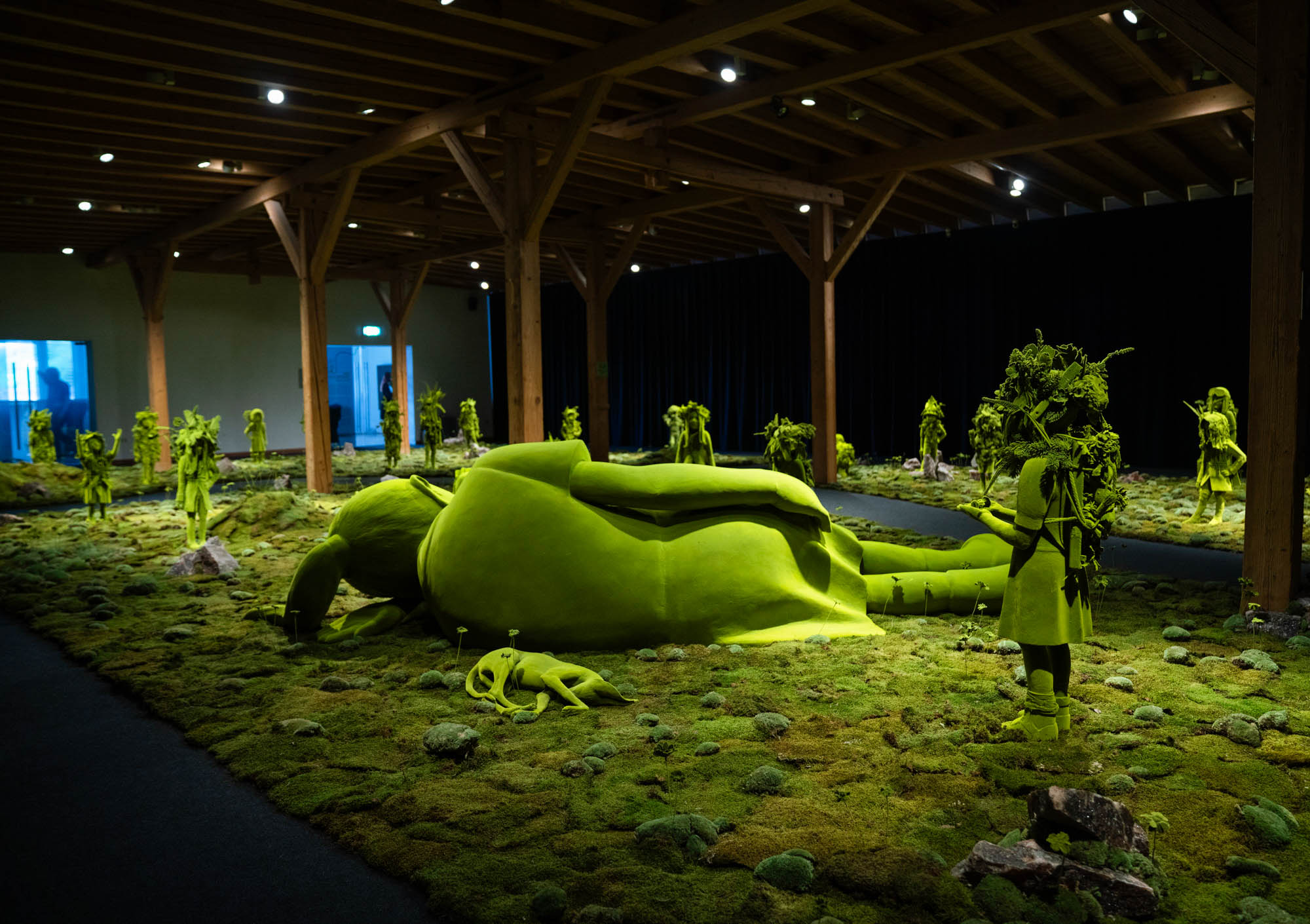 Als Besucher fühlt man sich in eine andere, zauberhafte und hinreissende Welt versetzt, sobald man die Ausstellung in den Räumlichkeiten der Gmundner Keramik Manufaktur betritt. Der finnische Künstler Kim Simonsson entführt den Betrachter in die fantastische Welt der "Moosmenschen" - lebensgrosse, kindliche Wesen aus Keramik, inszeniert in einer hyper-natürlichen Umgebung. Die spektakuläre Installation nimmt den gesamten Ausstellungsraum ein und lässt uns eintauchen: 23 Moosmenschen beobachten eine vier Meter grosse, in ihren Lebensraum eingedrungene, schlafende Riesin. Die Moosmenschen leben in einer utopischen Zukunft, in der sich die Natur die Welt zurückerobert hat. Sie sind mit Fundstücken unserer heutigen, dann untergegangenen Zivilisation ausgestattet. Inspiriert von der Sagenwelt seiner Heimat Finnland, aber auch von Comics und Mangas, hat der im Medium Keramik arbeitende Künstler seine rohen, aus gebranntem Ton geschaffenen "Waldmenschen" mit einer moosartigen Oberfläche aus gelber Beflockung mit Nylonfasern auf schwarz grundiertem Epoxid-harz überzogen. Der Harz ist elektrisch geladen. Die gelben Nylonfasern des Beflockungsgerätes werden von der Statik angezogen und bleiben in einem 90-Grad-Winkel im Epoxid stecken, wie Haare in der Haut. Der Künstler hat sehr viel Genugtuung aus diesen Skulpturen gewonnen, das sie für ihn persönlicher und expressiver in ihrer Persönlichkeit wirken. Und genau diese Genugtuung überträgt sich auch auf den Besucher und Betrachter der Ausstellung.