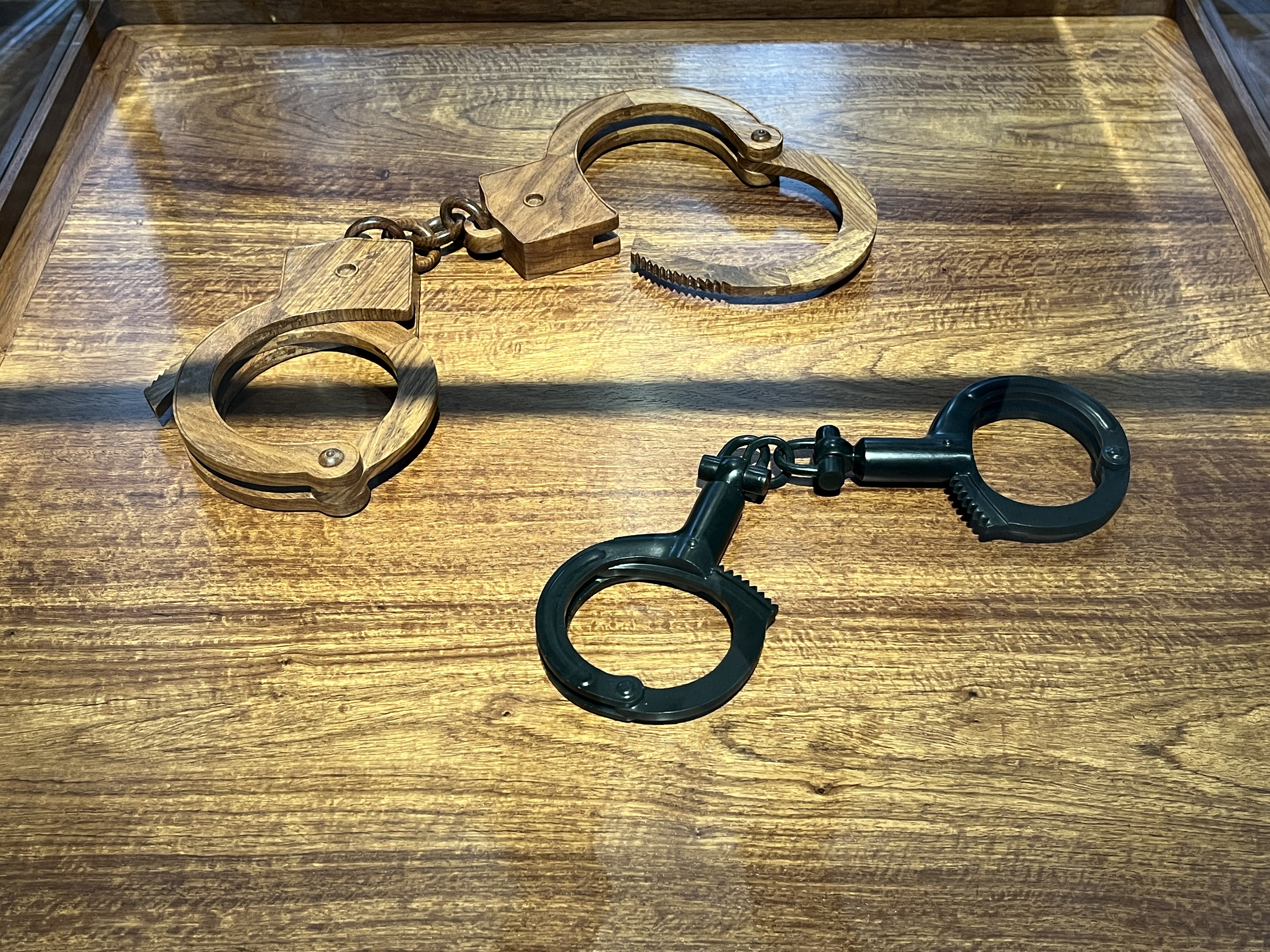 Marmorschlössl: Originalgetreue Nachbildung zweier Handschellenpaare aus traditionellen, in der chinesischen Kunst verwendeten Materialien: Ebenholz und Jade.
