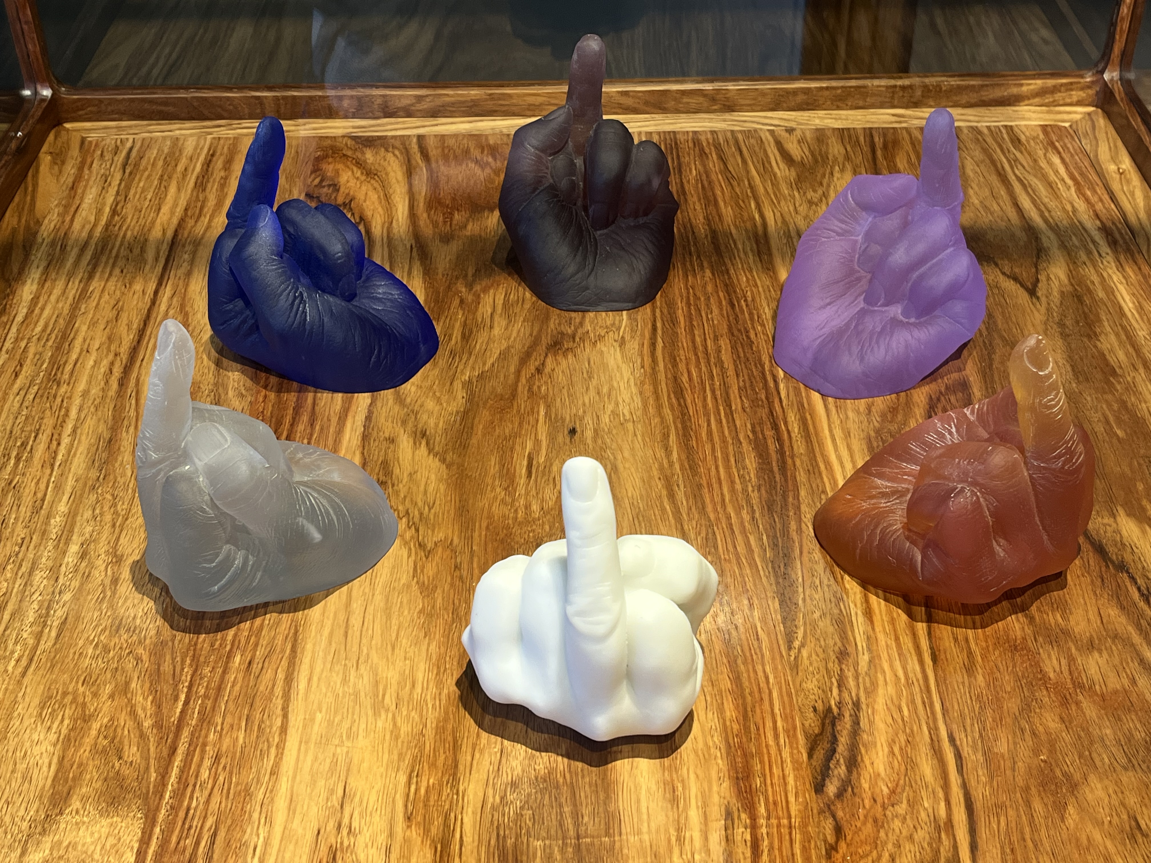 Ai Weiweis Antwort auf staatliche Behörden-Wilkür: 6 x Stinkefinger ebenfalls aus verschiedenfarbigem Murano-Glas.