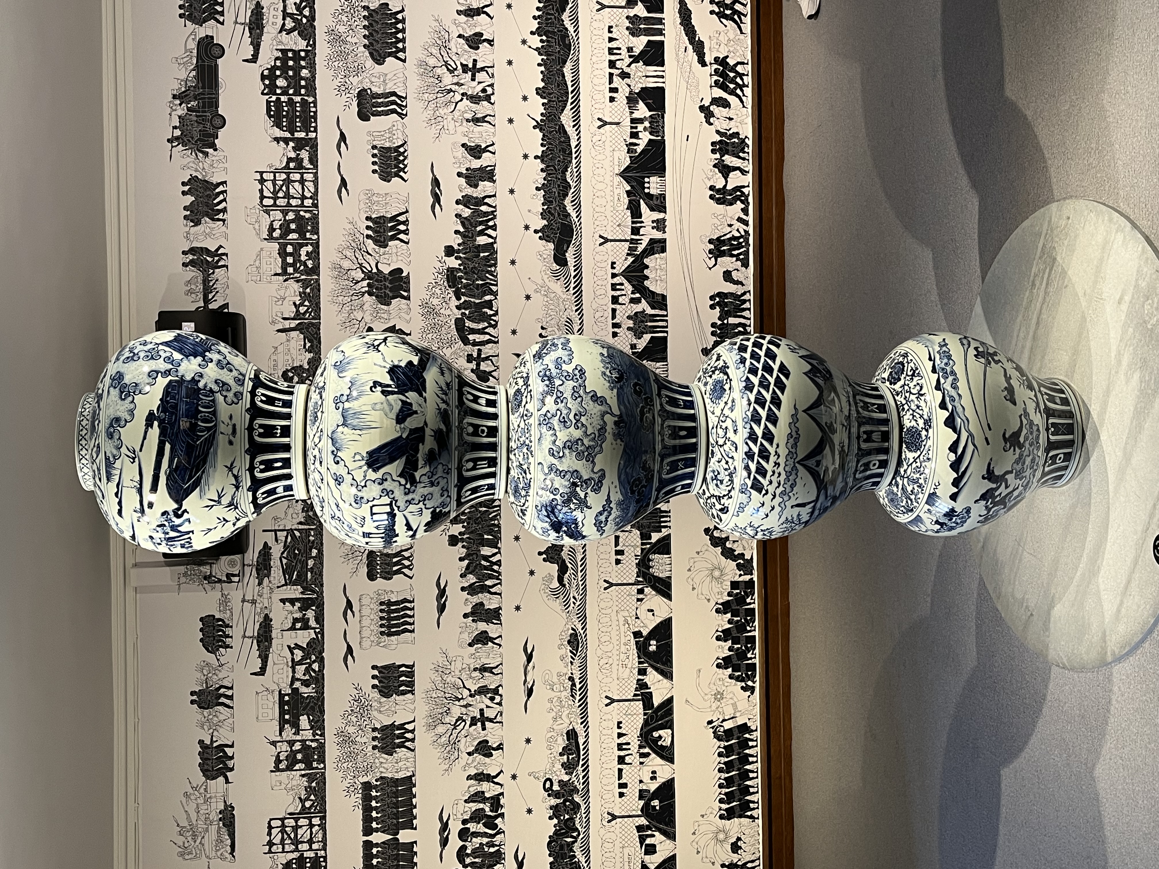 Traditionell in den Farben Blau-Weiss hergestellte chinesische Porzellanvasen mit Kriegsmotiven, Grösse: 312,0 x 51,0 x 27,0 cm und von Ai Weiwei im antik-griechischen Stil entworfene Tapete mit Militärmotiven.