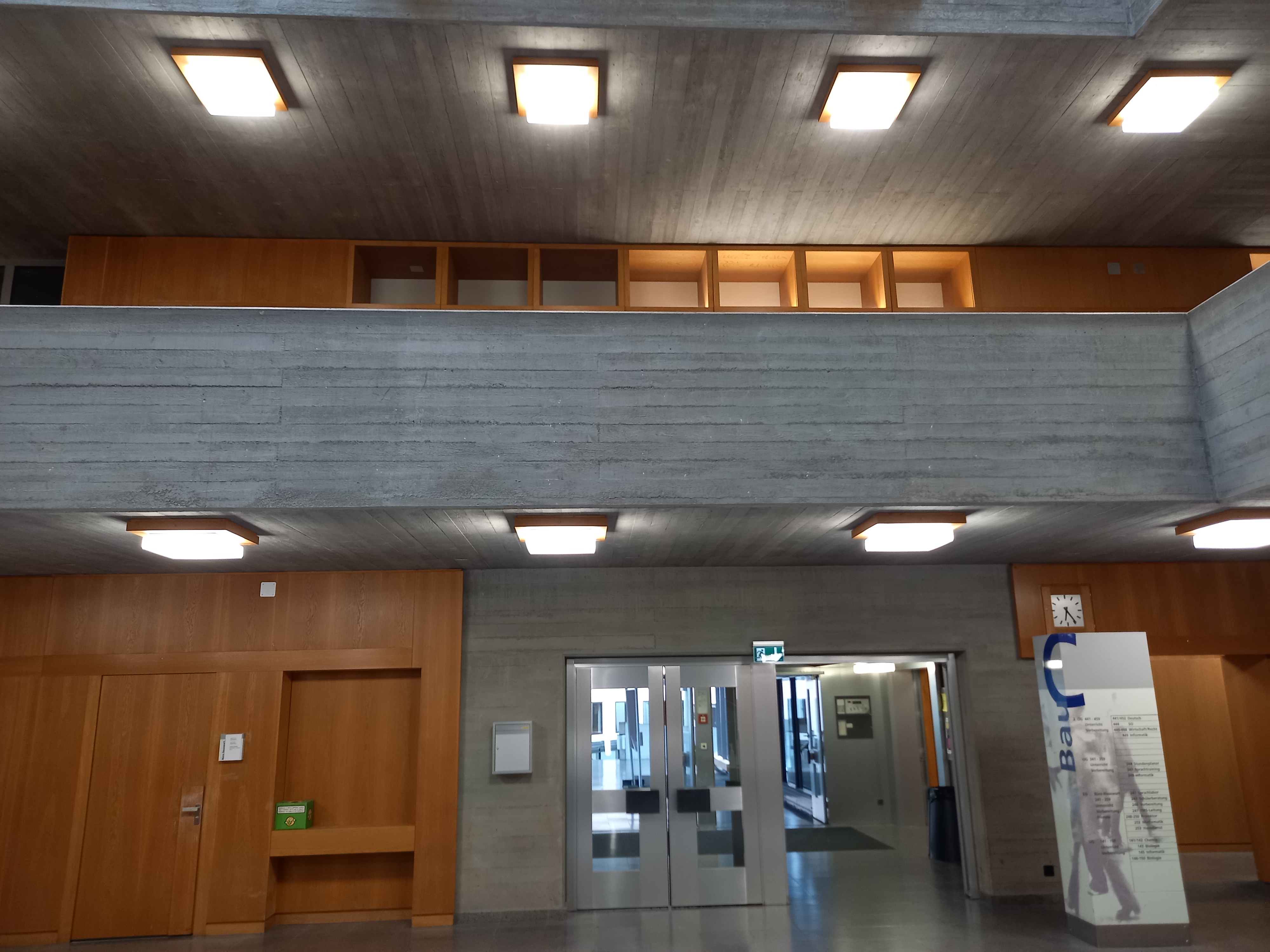 Der Förderer-Bau umfasst zwei Gebäude, ein neues Schulhaus (Bau C) und eine neue Turnhalle (Bau E). Beide sind im Stil des Brutalismus gehalten, eine Stilrichtung, zu deren wichtigsten Schweizer Vertretern Walter M. Förderer gehörte. Das neue Schulhaus ist in südöstlicher Richtung in Hanglage Richtung Schaffhauser Altstadt gebaut. Es ist viel niedriger als der Altbau von 1902 und weist ein Flachdach auf. Es bildet somit architektonisch einen klaren Kontrast, jedoch optisch keine Konkurrenz zu dem bereits bestehenden Gebäude. Der Grundriss ist nahezu quadratisch, allerdings sind die Wände jeweils in der rechten Hälfte der Fassade zurückversetzt. Gegen die Stadt hin läuft das Gebäude terrassenförmig aus. Die Fassade zeigt, typisch für den Baustil des Brutalismus, holzbrettstrukturierten Ortbeton, gegliedert durch grossflächige, horizontal orientierte, mit Aluminiumrahmen eingefasste Schiebefenster. Das Gebäude umfasst 4 Etagen, wobei das Untergeschoss in den Hang hinein gebaut wurde. Das Erdgeschoss und die beiden darüber liegenden Etagen sind um einen durch Oberlichter im Dach erhellten Lichthof zentriert. Eine um den Lichthof herumgeführte Galerie verbindet die Schulzimmer miteinander.