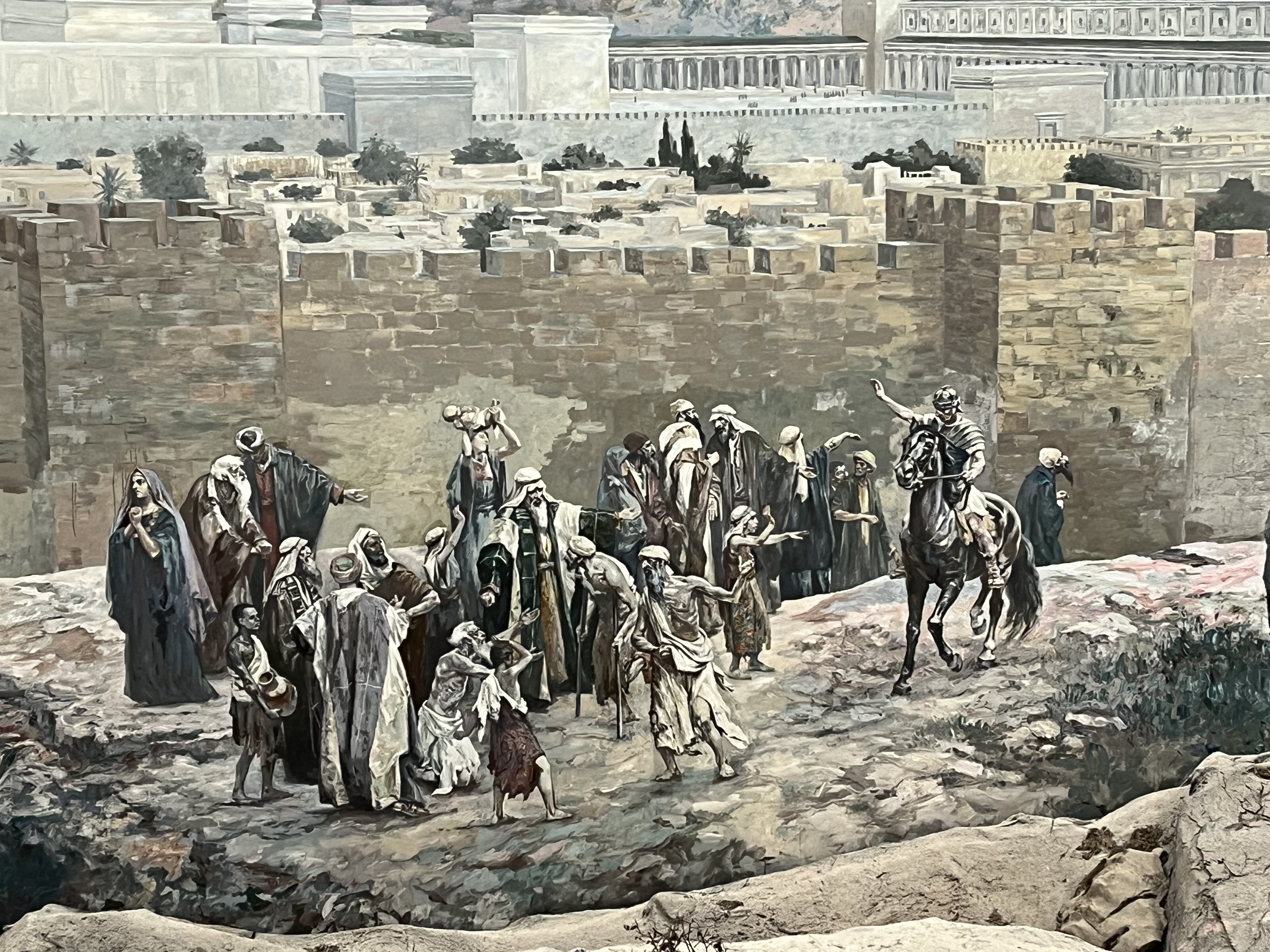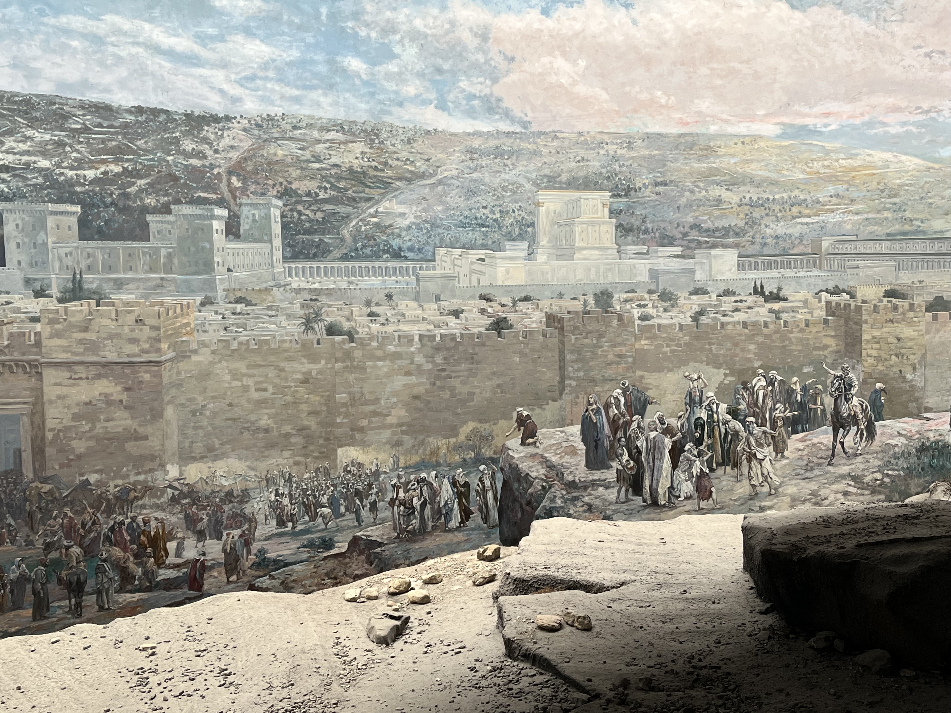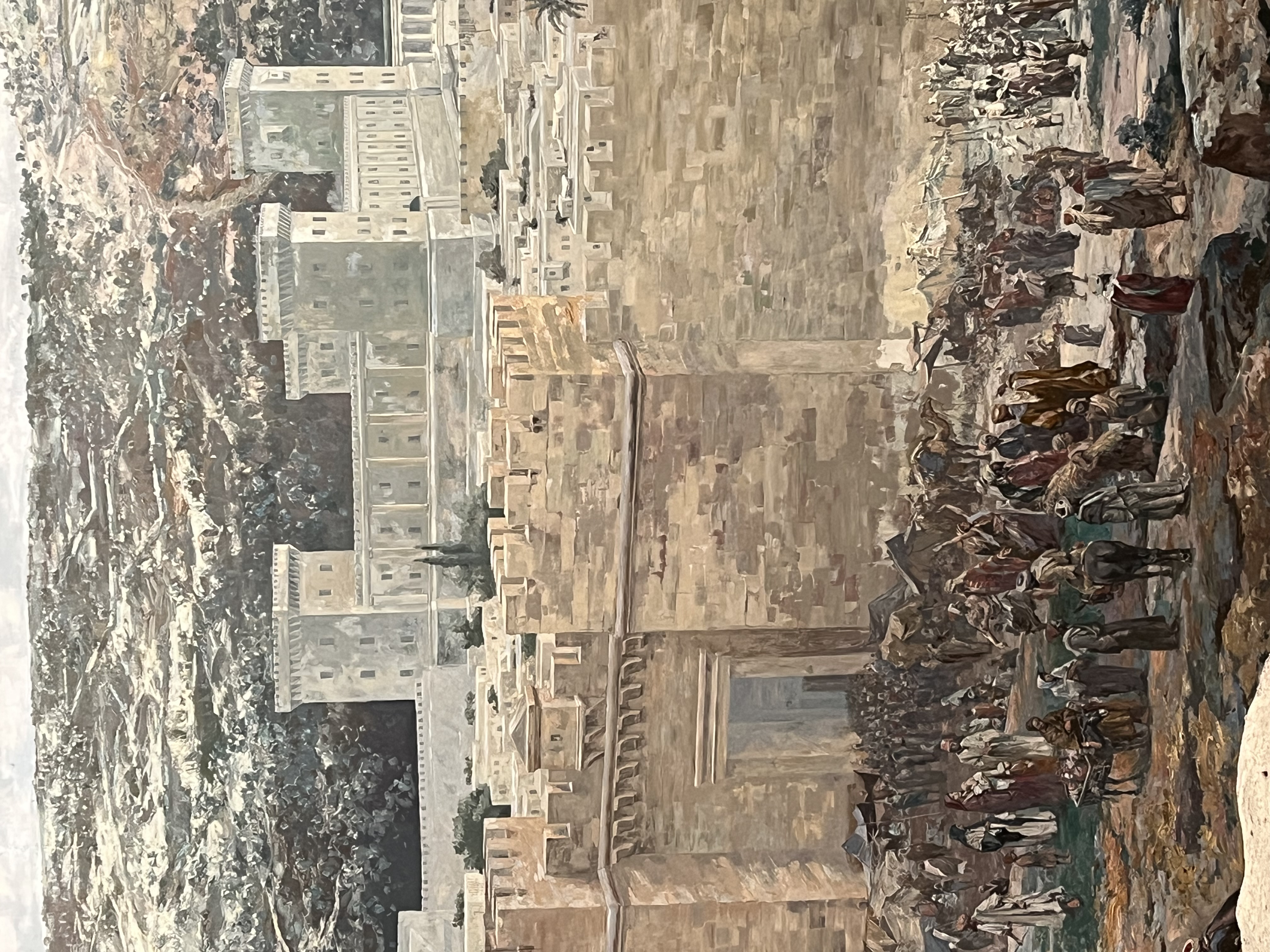 Schaulustige versammeln sich vor der Stadtmauer. Links die Burg Antonia mit ihren vier Türmen. Rechts der 52 Meter hohe Herodianische Tempel aus weissen Marmorquadern aufgebaut, anschliessend die Halle Salomos. Im Hintergrund das Tal Josaphat, die Strasse nach Betphage und der Berg Moria.