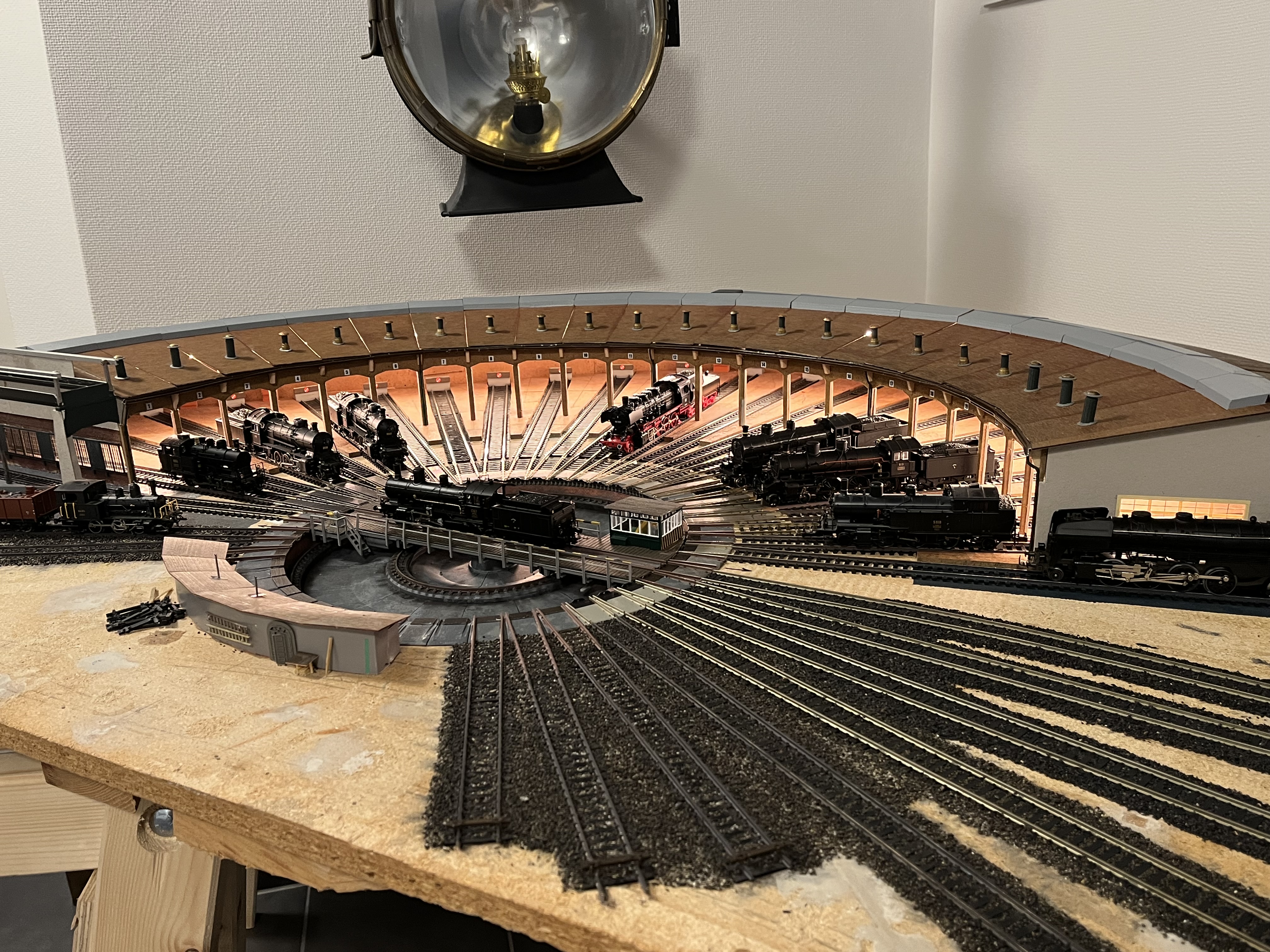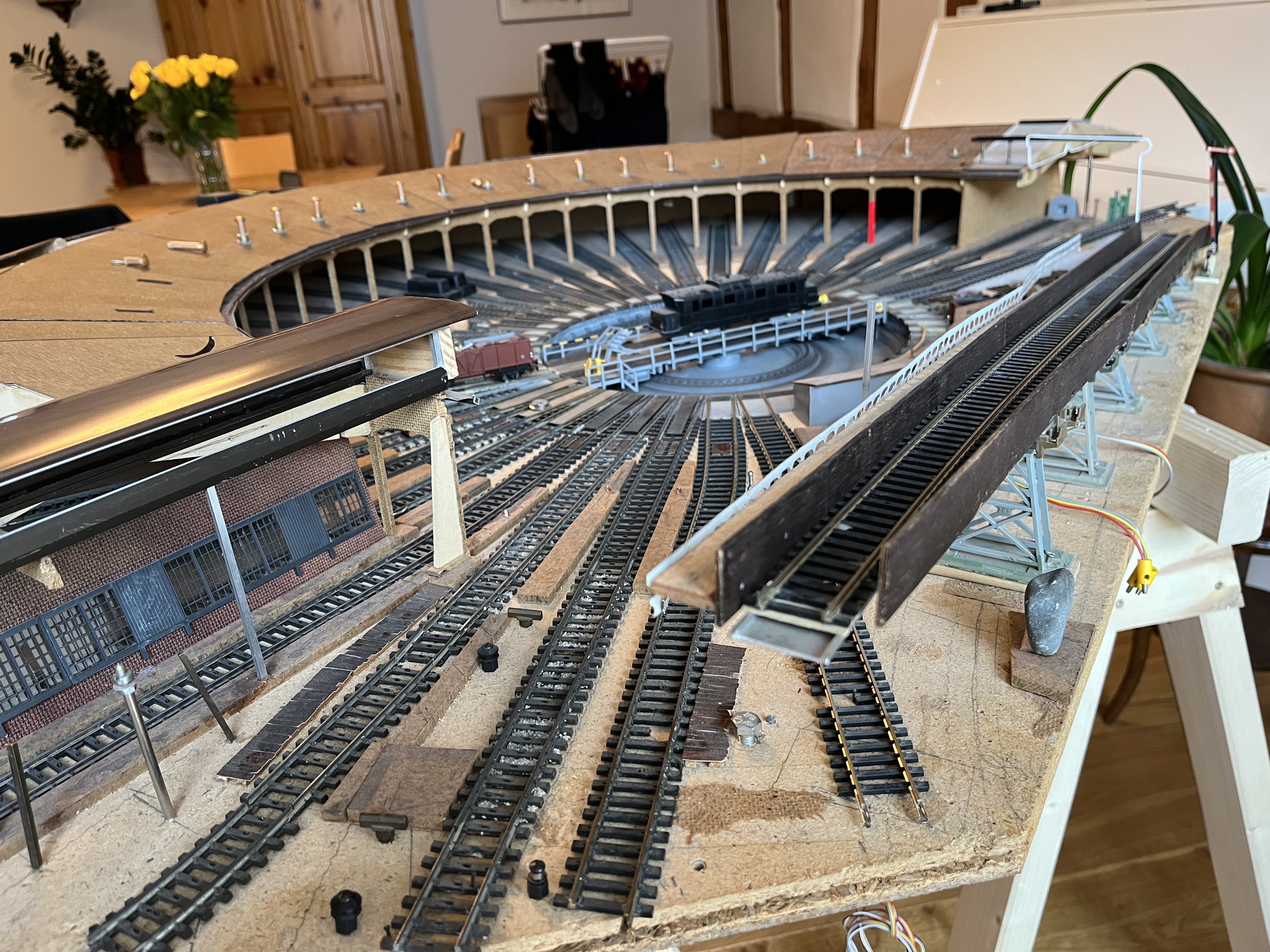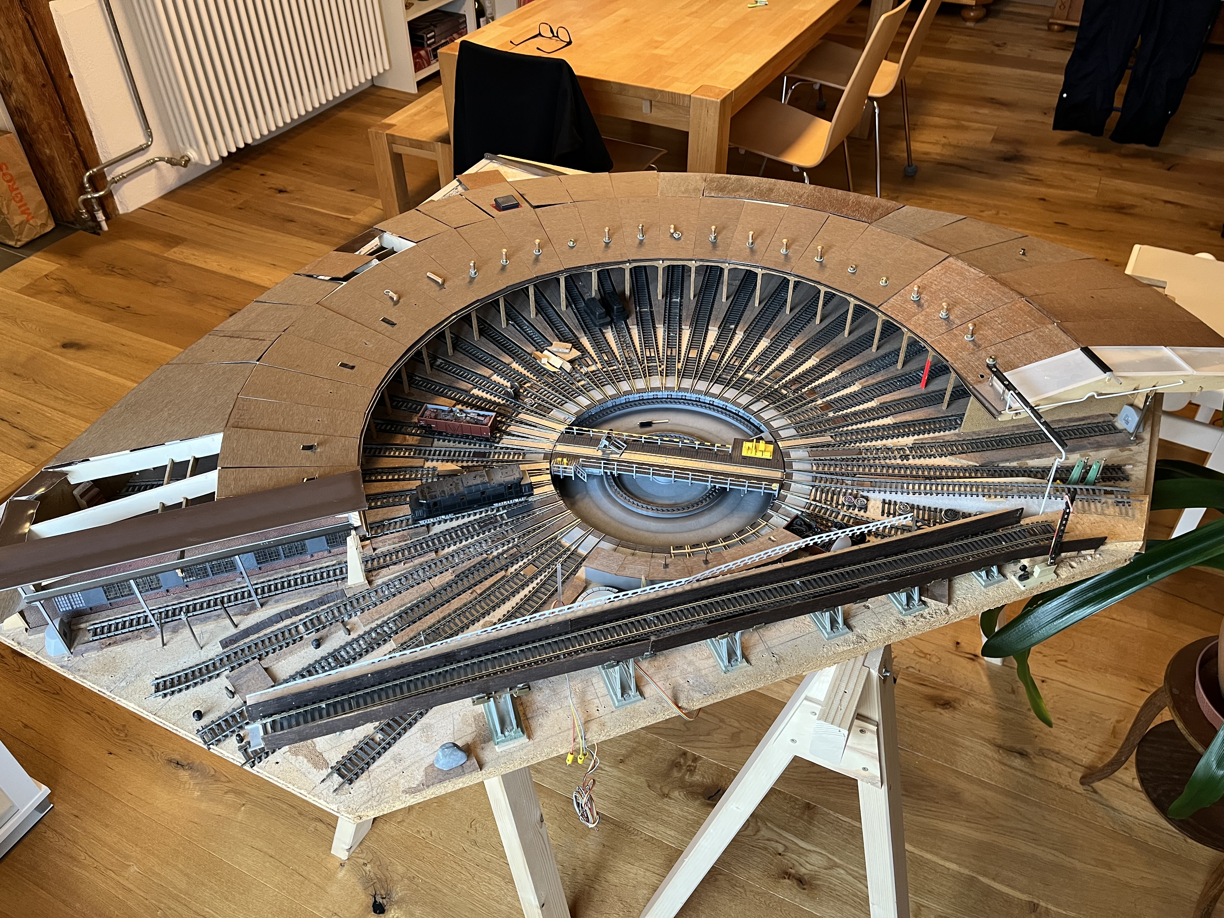 Eine erste "Visualisierung" der Anlage sieht schon sehr vielversprechend aus. Noch fehlen die elektrischen Anschlüsse zu den Gleisen und der definitive Einbau der Drehscheibenbühne.