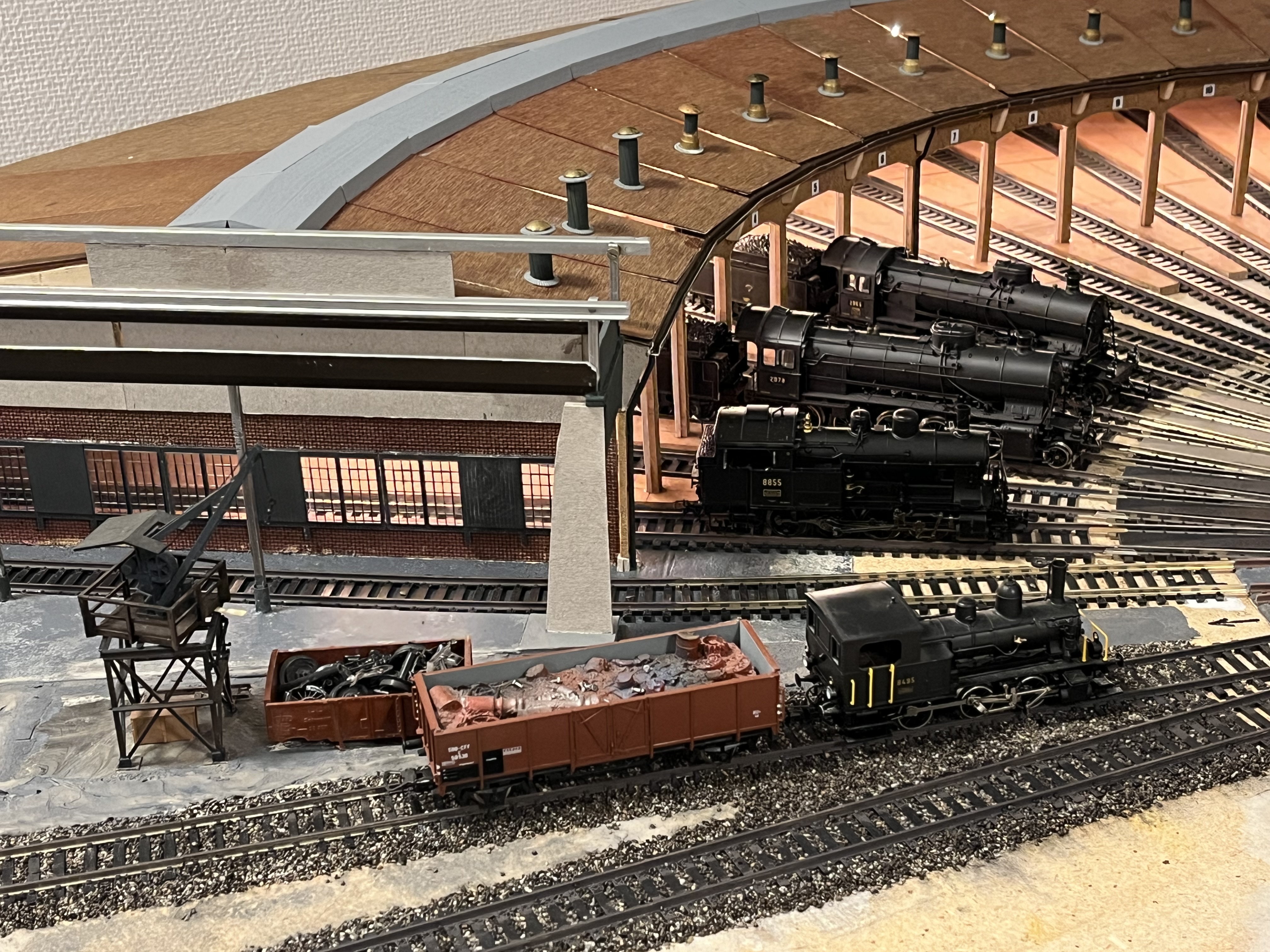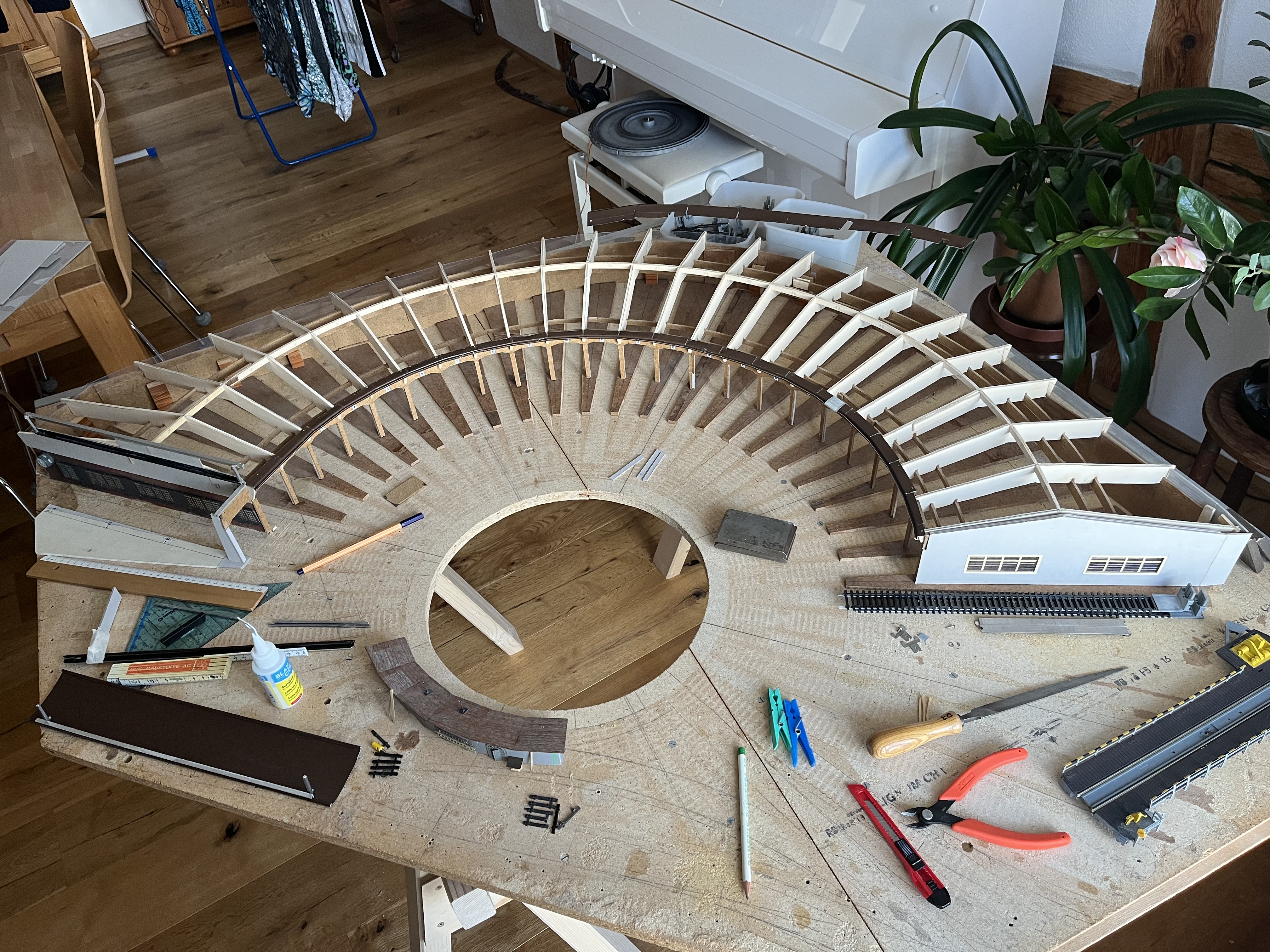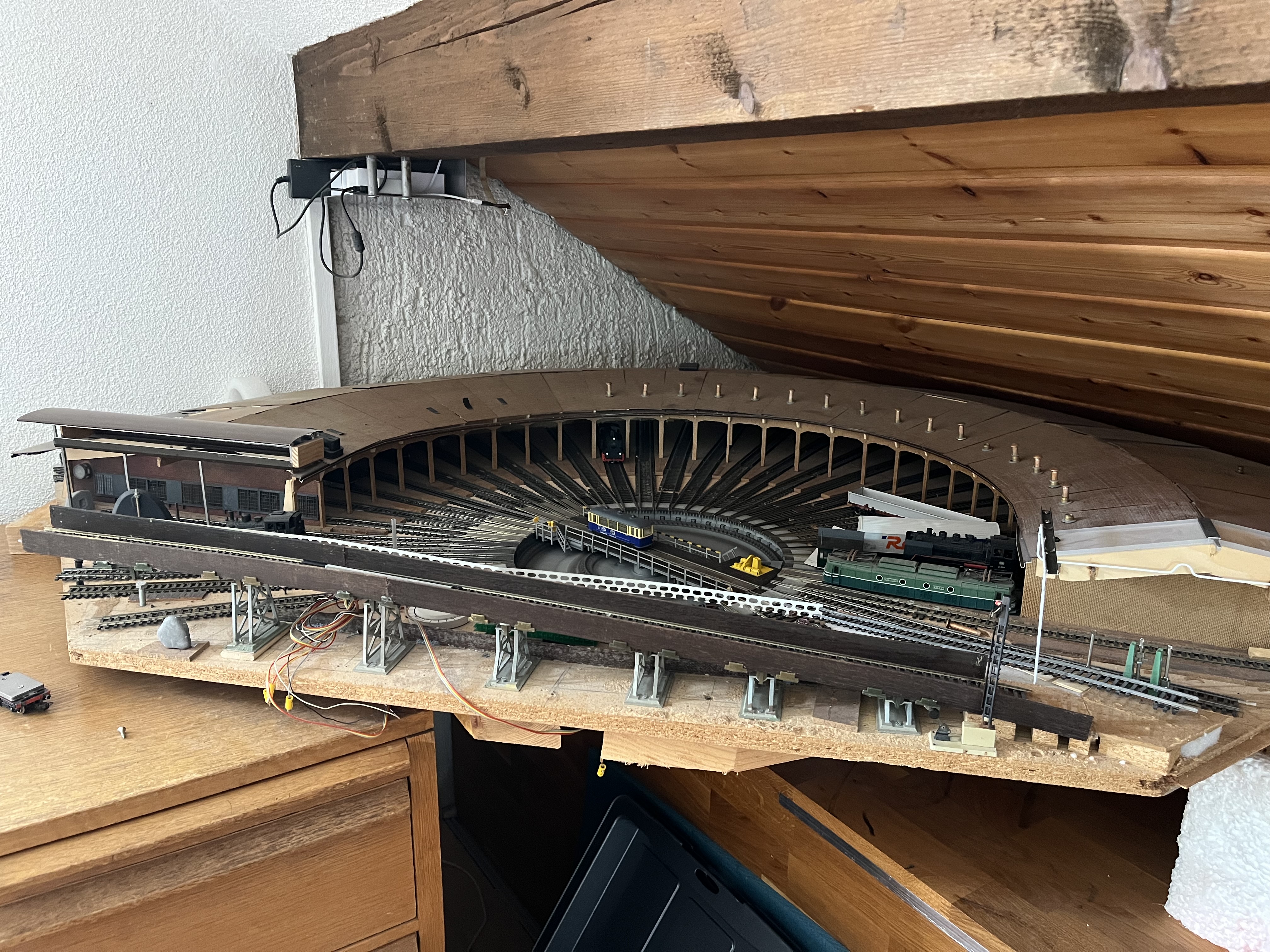Eine erste "Visualisierung" der Anlage sieht schon sehr vielversprechend aus. Noch fehlen die elektrischen Anschlüsse zu den Gleisen und der definitive Einbau der Drehscheibenbühne.