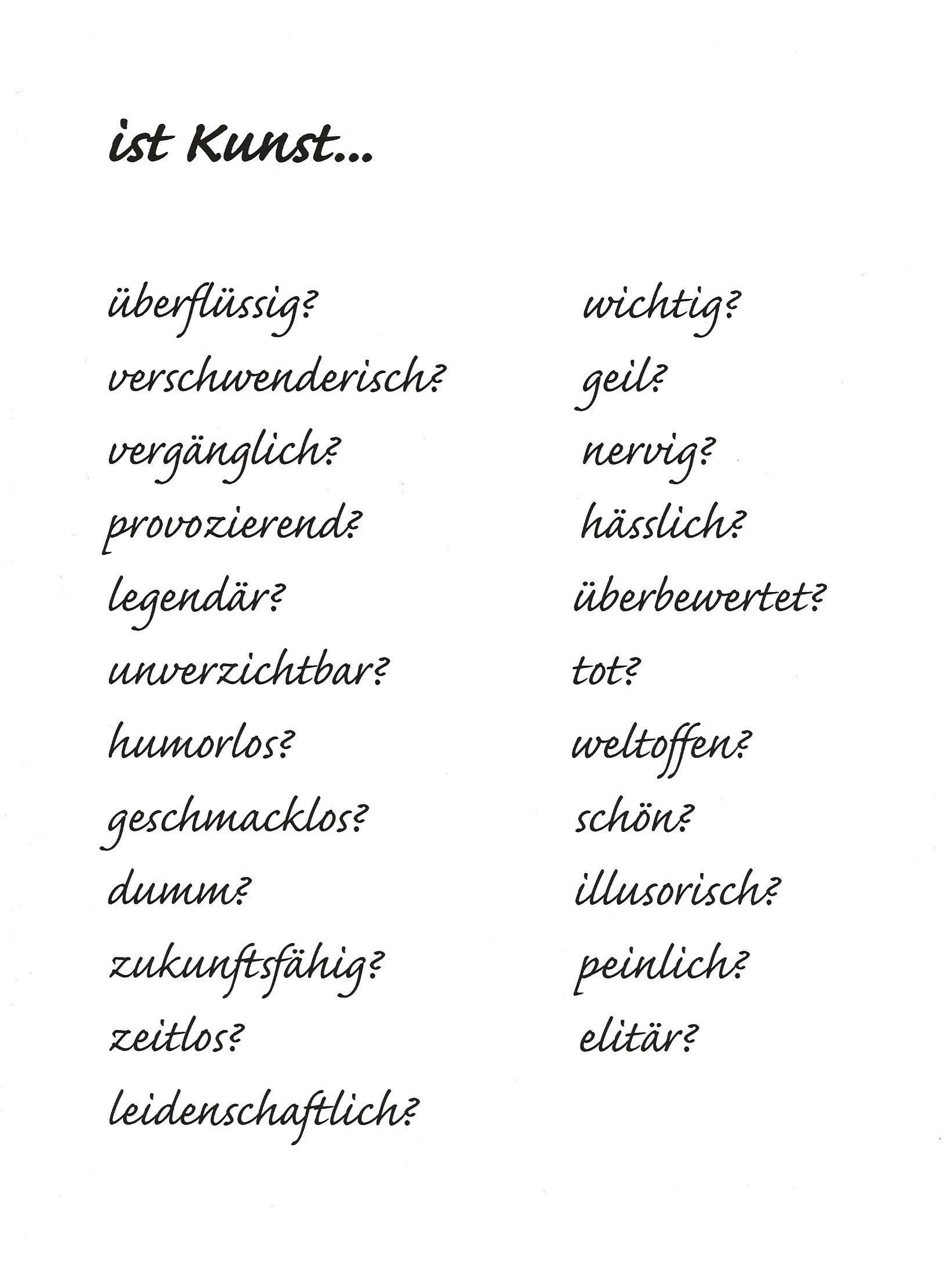 Doris blühte in den Hallen richtiggehend auf. Wenn sie interessierten Besuchern Auskünfte erteilen konnte, sei es speziell über die ausgestellten Objekte, als auch über Minimal Art im Allgemeinen, war sie in ihrem Element. Ihr Fachwissen eignete sie sich sowohl im Verlaufe zahlreicher Führungen an, der sie ja gezwungenermassen beiwohnen musste, als auch an Veranstaltungen zur Schulung des Personals, die jeweils durch Urs Raussmüller organisiert wurden.